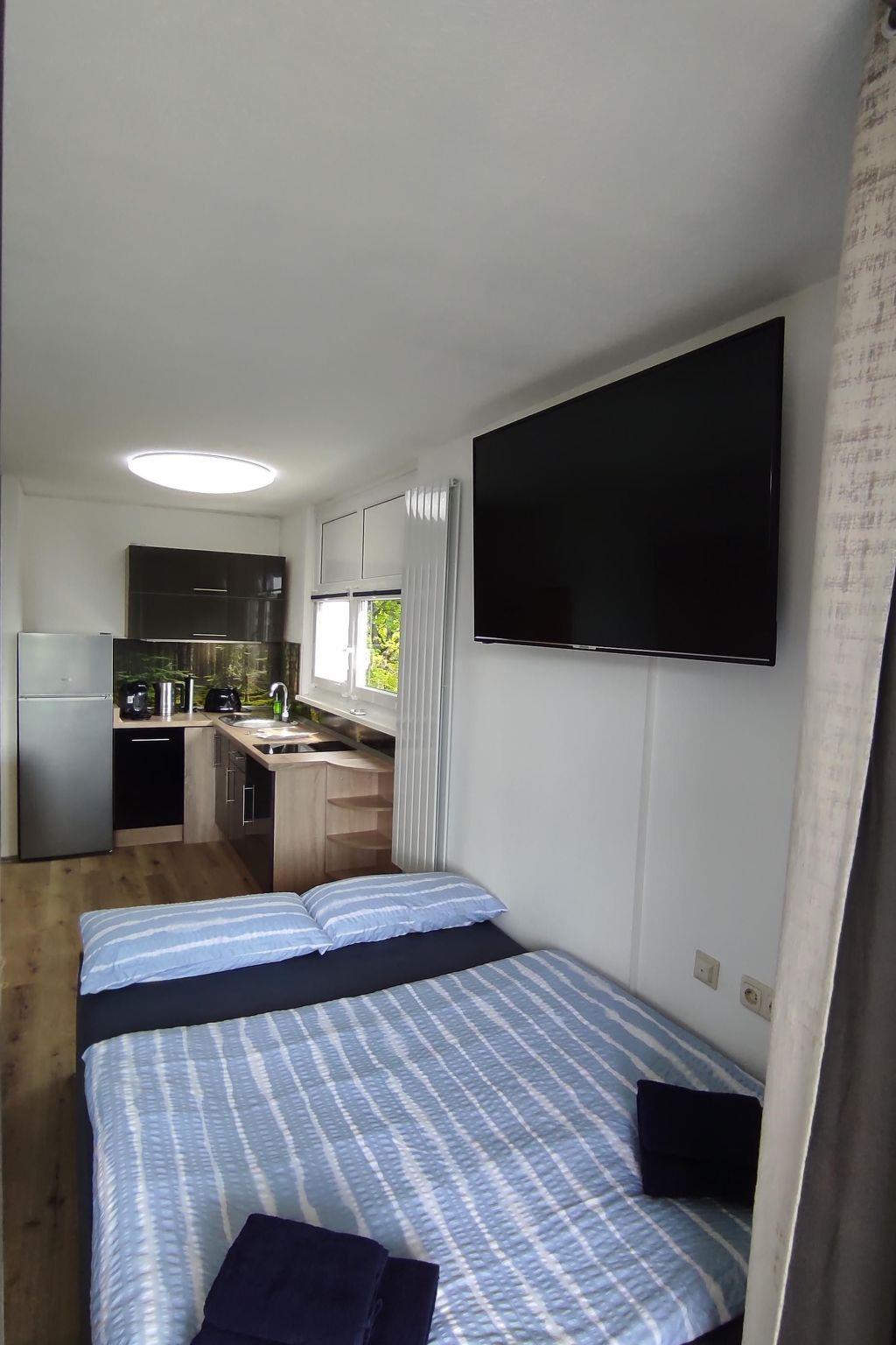 The 33m² flat consists of a combined living room and bedroom with kitchenette and a modern shower room. From the large balcony you have a wonderful view of the surrounding mountains and the forest down to the Danube valley - and on clear days even as far as the Alps. The sleeping facilities, a box-spring bed and a sofa bed (pull-out) offer space for up to three people: two adults and max. two children, also for three adults and simply for two adults. The flat is equipped with: free fresh towels and bed linen, a hairdryer, a high-quality flat-screen TVThe fully equipped kitchen has a refrigerator, two electric hobs, kettle, coffee maker, pans, pots, cooking utensils, crockery. Washing machines and dryers are available in the holiday complex. Washing tokens can be purchased at reception. Free WLAN is available in the flat.