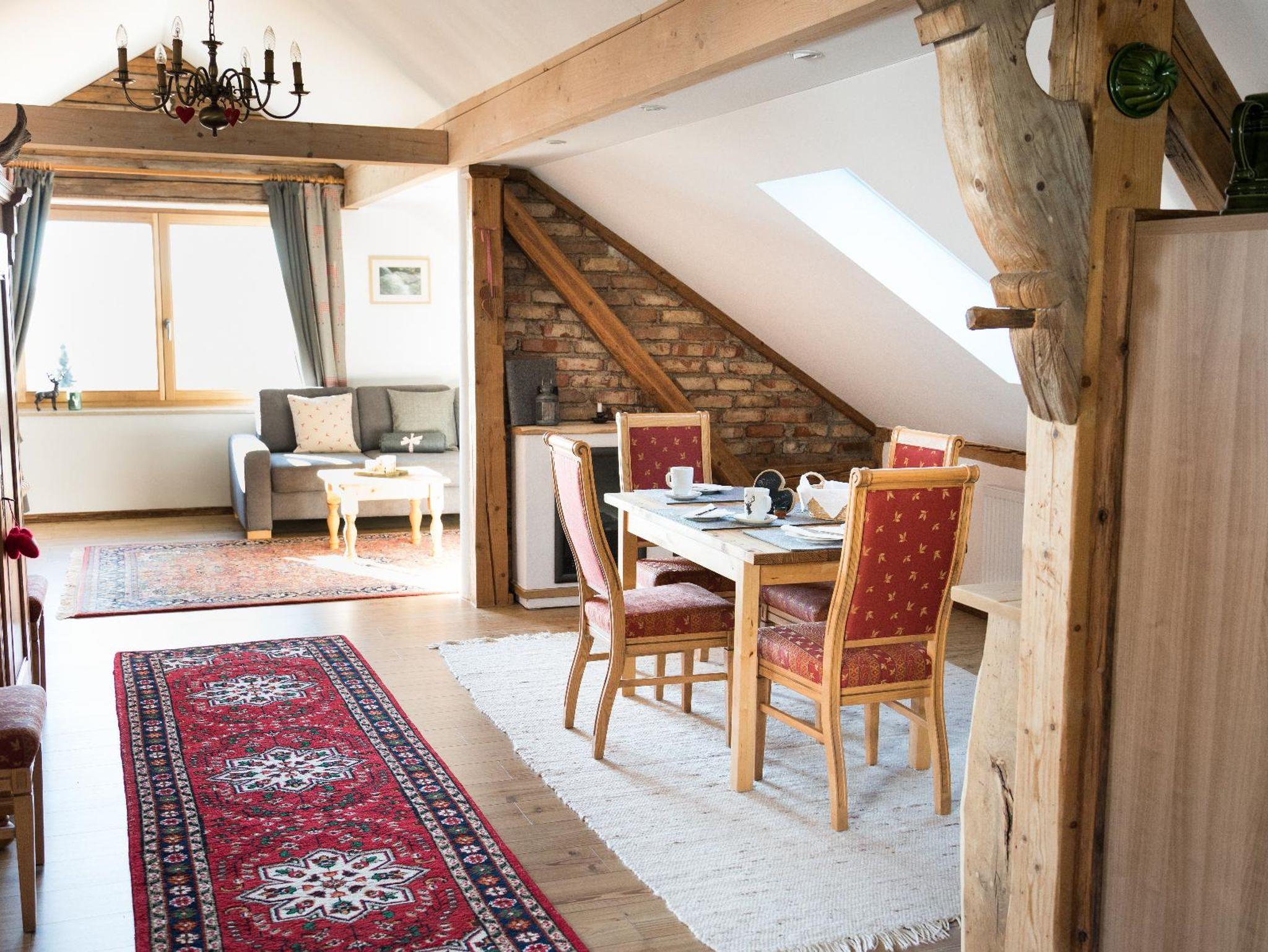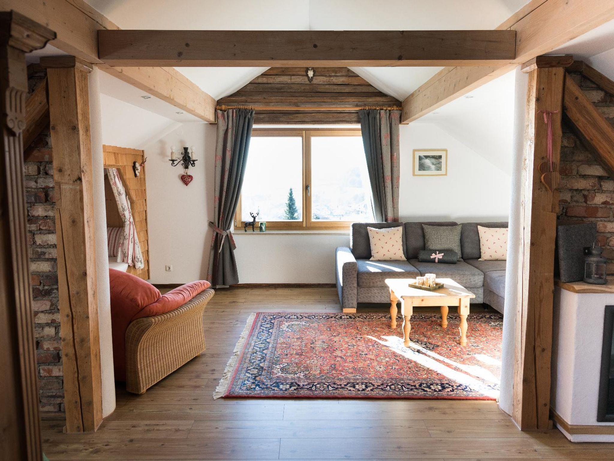 Erwachsenen sowie großem Panoramafenster. Die freigelegten, antiken Holzbalken und