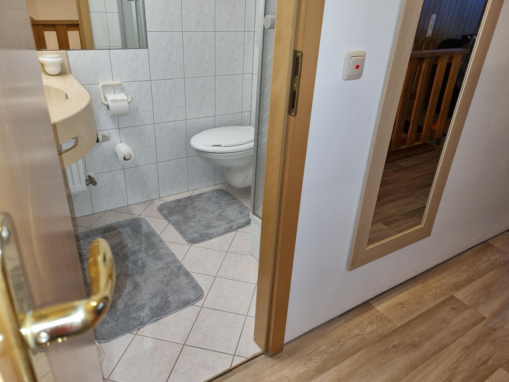 Das Badezimmer ist mit ein Waschbecken, Dusche, WC , Handtücher, Seife und Toilettenpapier, Kinder Toiletten-Aufsatz und Hocker ausgestattet.