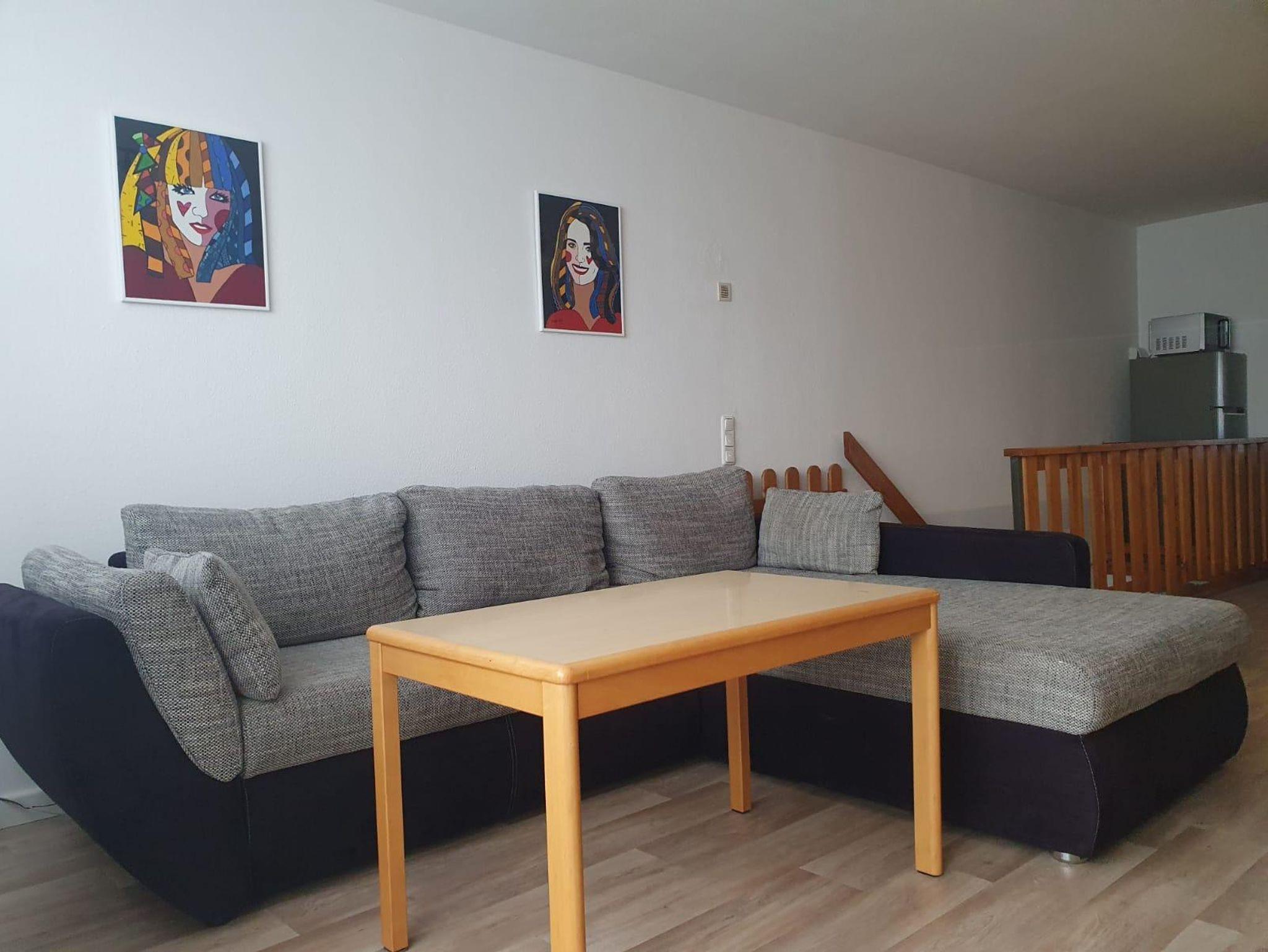 Der Wohnraum verfügt zudem über einen Smart-TV, eine ausziehbare Schlafcouch, ein Schrankbett und einen Couchtisch.