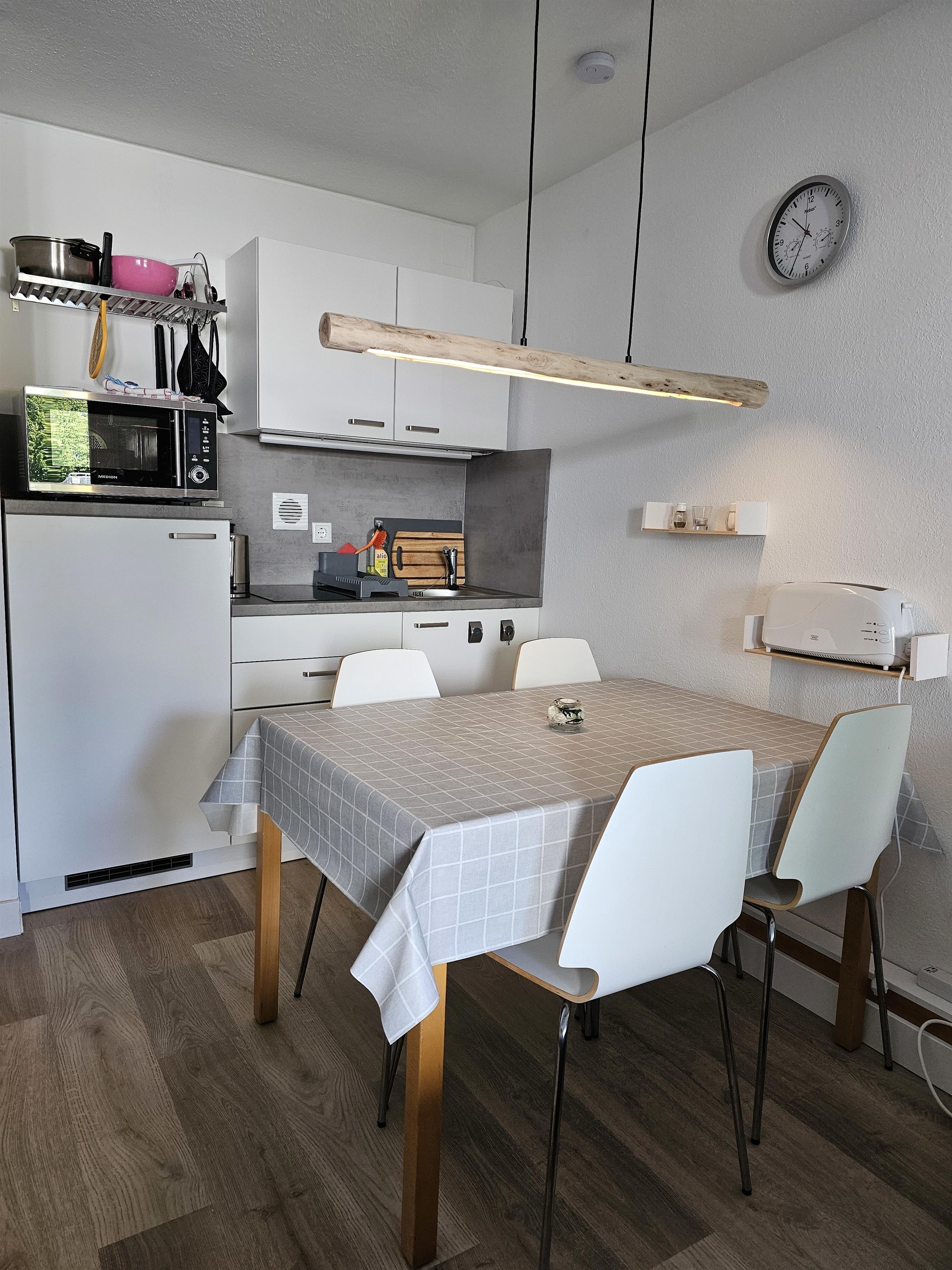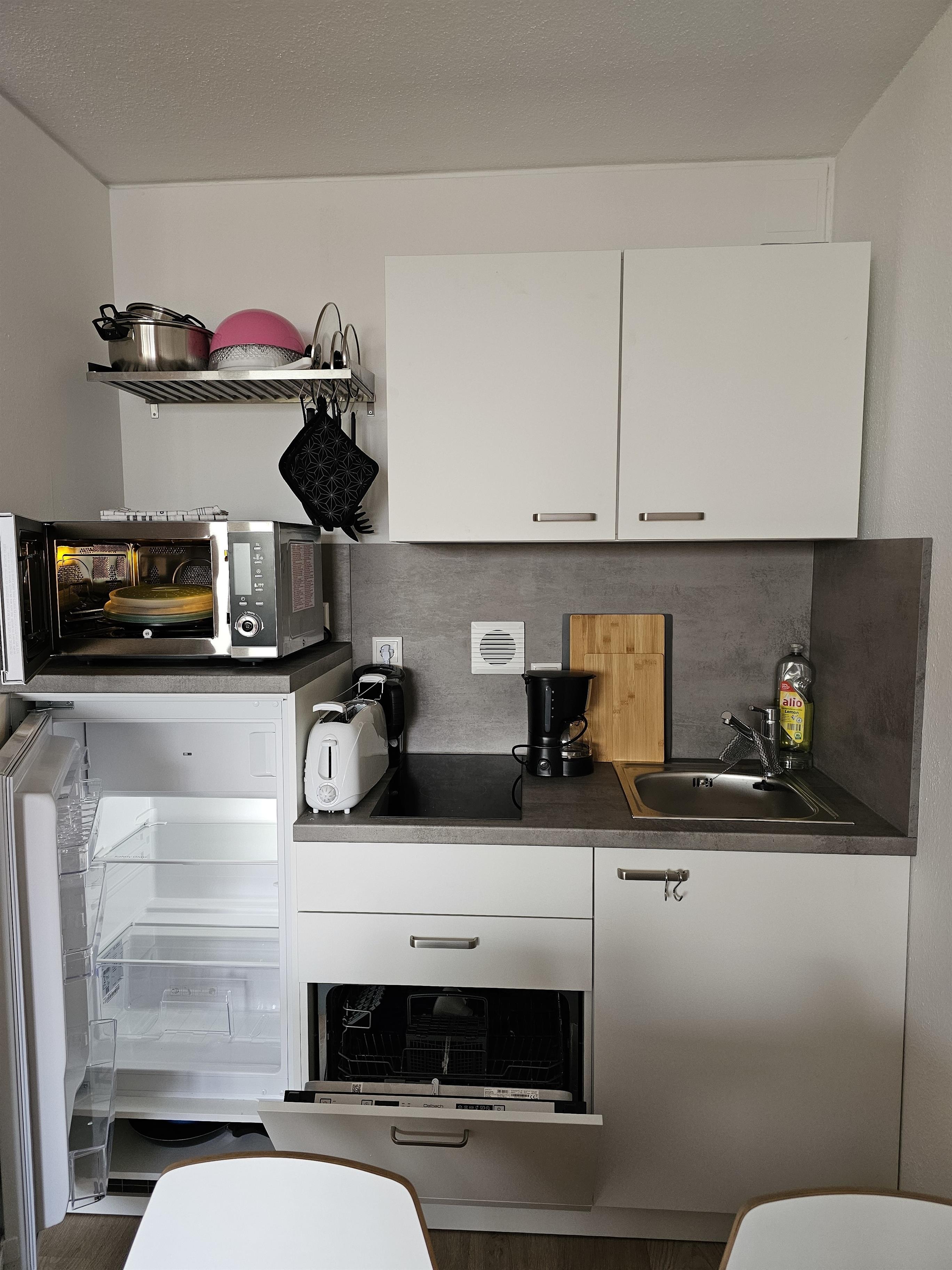 Sie verfügt über eine moderne, umfassend ausgestattete funktionale Einbauküche. Diese beinhaltet u. a. einen Kühlschrank, eine Geschirrspülmaschine, eine Mikrowelle mit Backofenfunktion, einen Toaster, eine Kaffeemaschine und einen Wasserkocher.