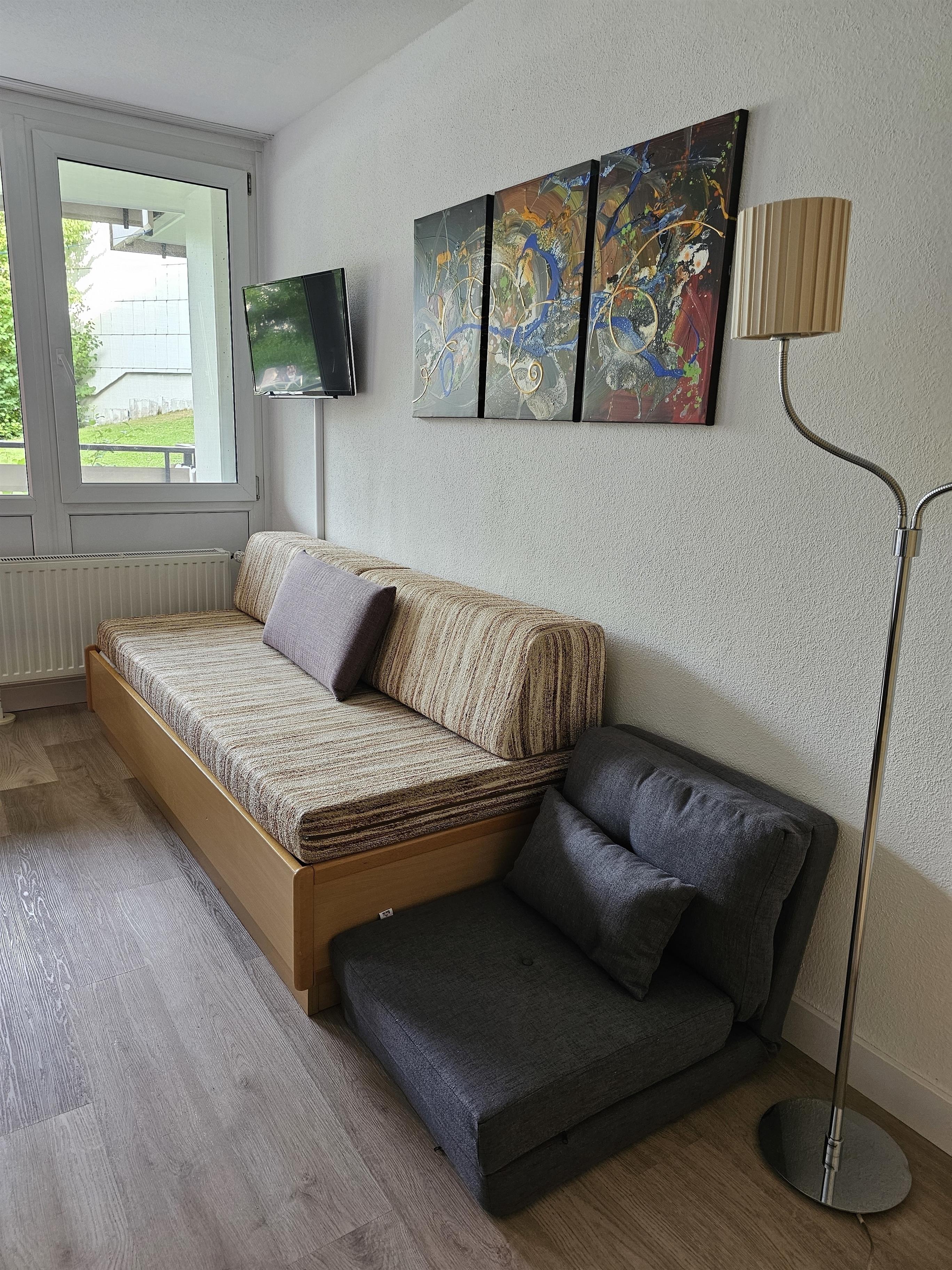 Das 33m² großes Apartment bietet Platz für bis zu 3 Personen, die auf einem bequemen Boxspringbett (160 cm x 200 cm) und einer Schlafcouch (ca. 90cm × 200 cm) übernachten können.
