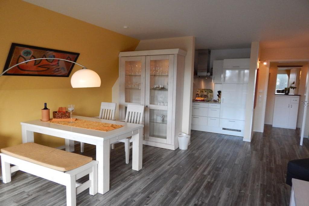 Herzlich willkommen in dieser schönen Ferienwohnung! Die Luxusausstattung der Ferienwohnung wird bei Ihnen keine Wünsche offen lassen. So erwarten Sie exklusive Möbel, Accessoires - allerlei Annehmlichkeiten sind stilvoll aufeinander abgestimmt. In den hochwertigen Bädern in der 1 und 2 Etage in Granitausstattung gibt es eine Dusche, sowie einen Handtuchwärmer mit Handtüchern und Bademänteln. Klimatisierte Schlafzimmer. Die geräumige Küche ist mit allem ausgestattet, was zu einem angenehmen Kochen gehört. Selbstverständlich gibt es im gemütlichen Wohnzimmer Telefon, TV und DVD-Player mit Stereoanlage. Die überdachten Balkone oben und unten in der Ferienwohnung laden zum Verweilen ein. Die gesamte Ferienwohnung verfügt über eine Fußbodenheizung auf 2 Ebenen. Genießen sie auch unseren Wellnessbereich mit finnischer Sauna, Wärmekabine und Sonnenbank.