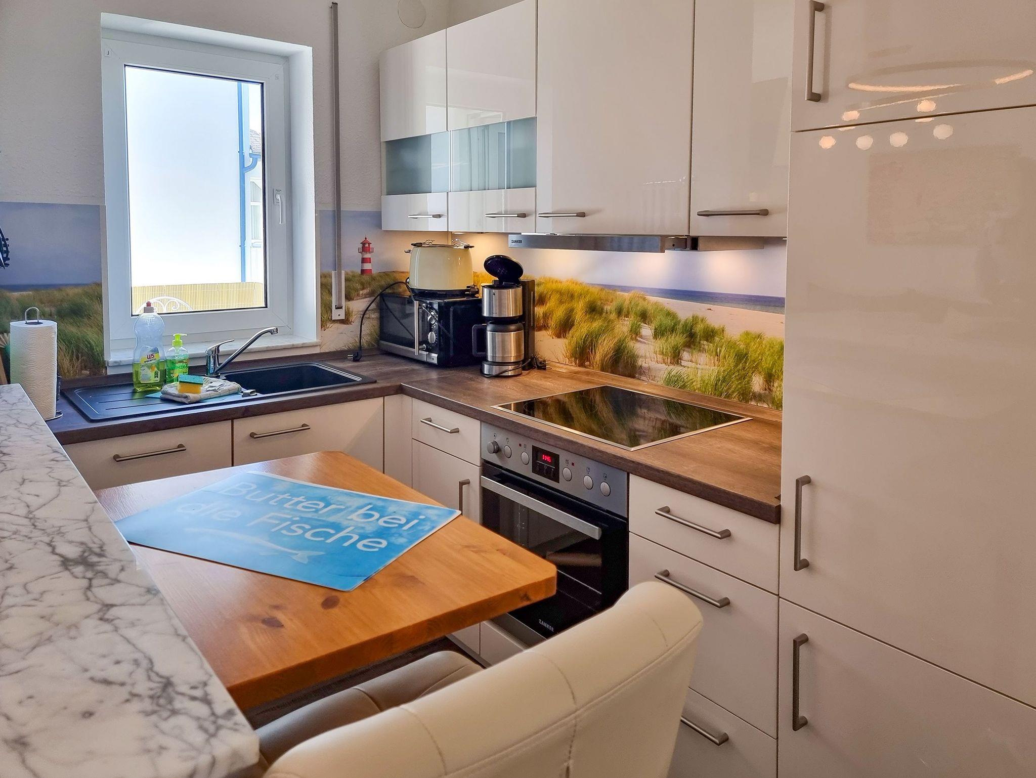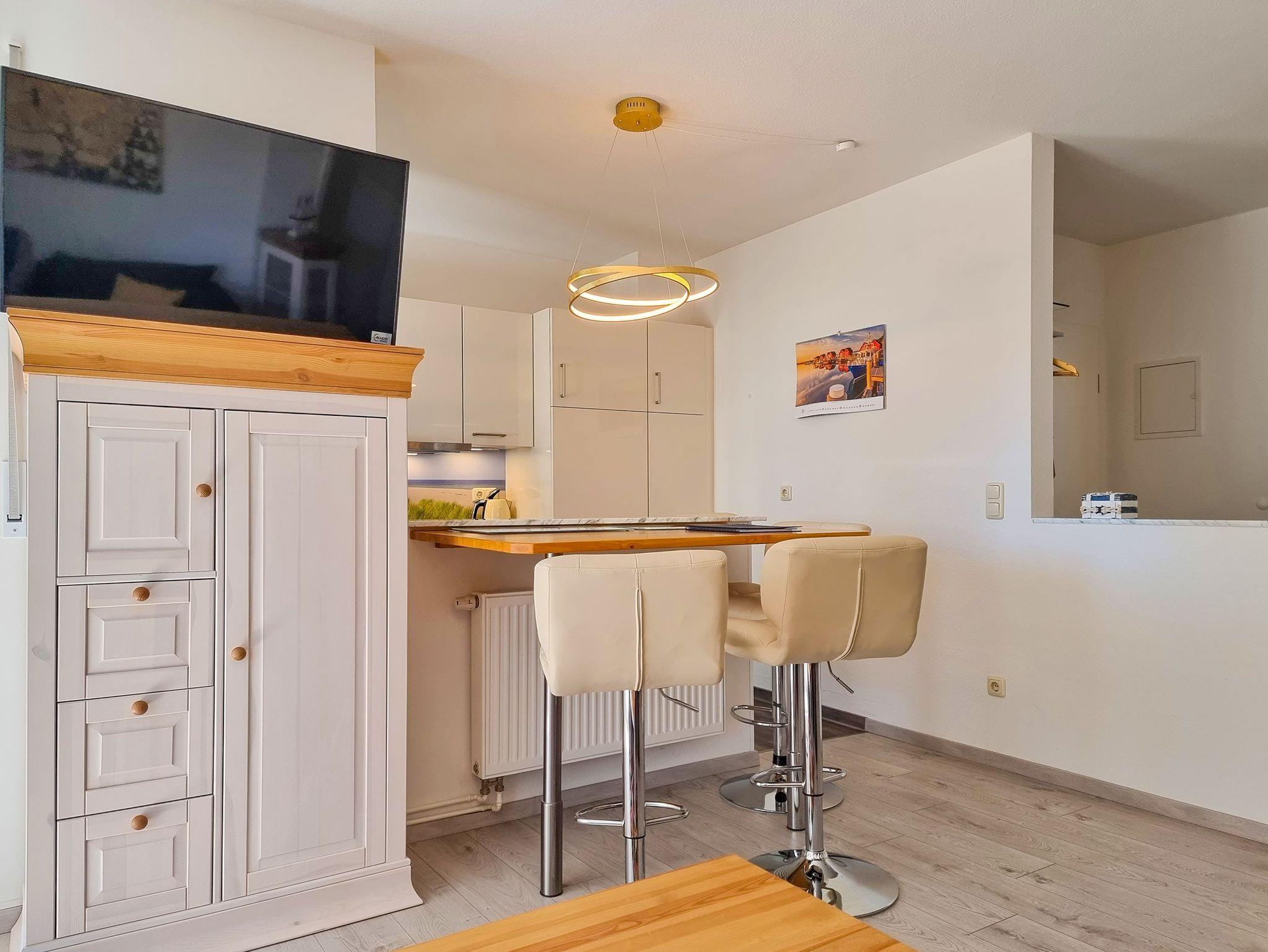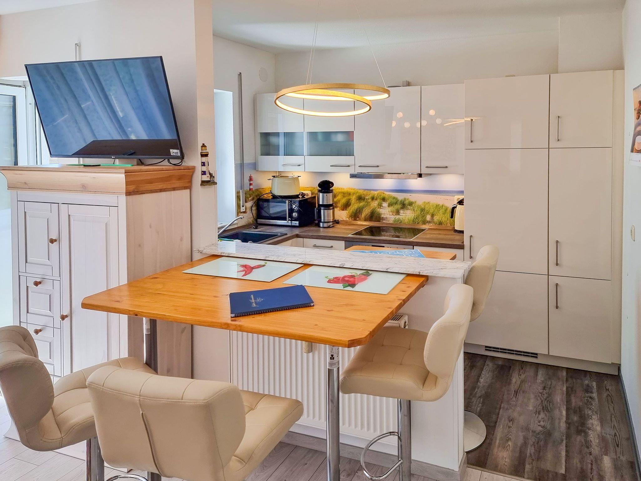 ? Das Wohnzimmer ist mit einer gemütlichen Couch, kleinem Tisch und SMART-TV eingerichtet. Die angrenzende Kühe ist durch den Essbereich zum Wohnzimmer optisch getrennt.