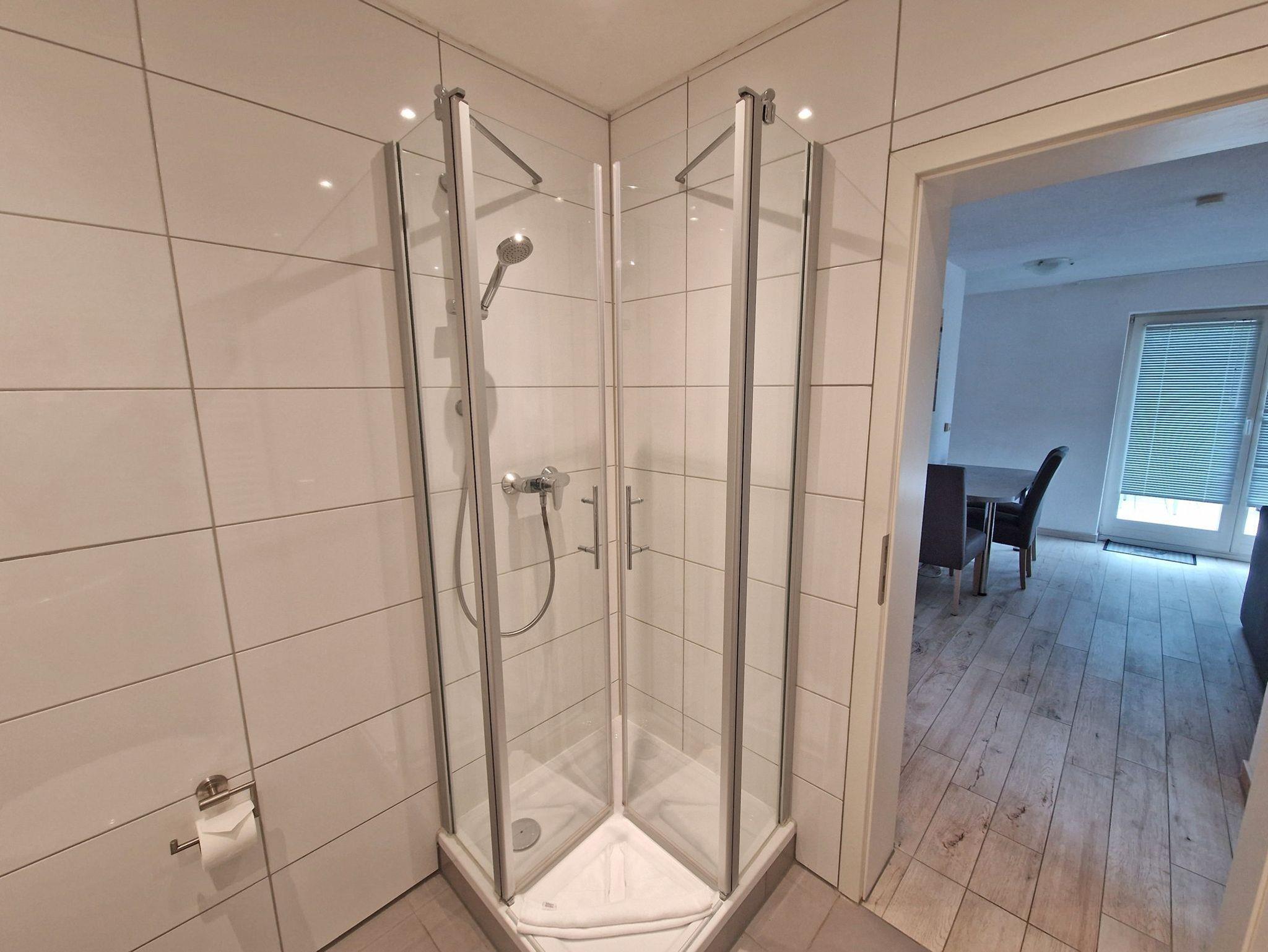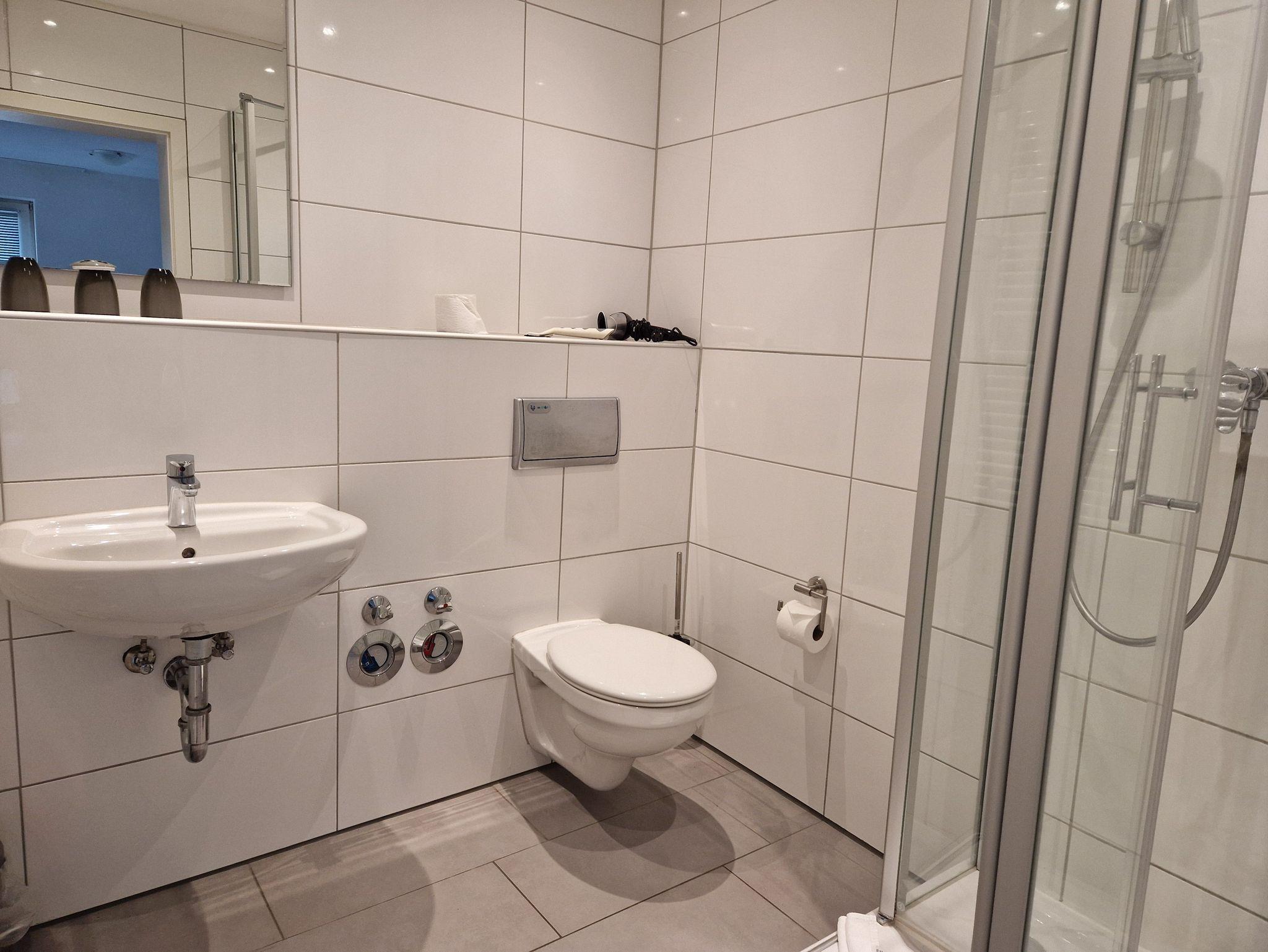 ? Ein Badezimmer mit Dusche und WC