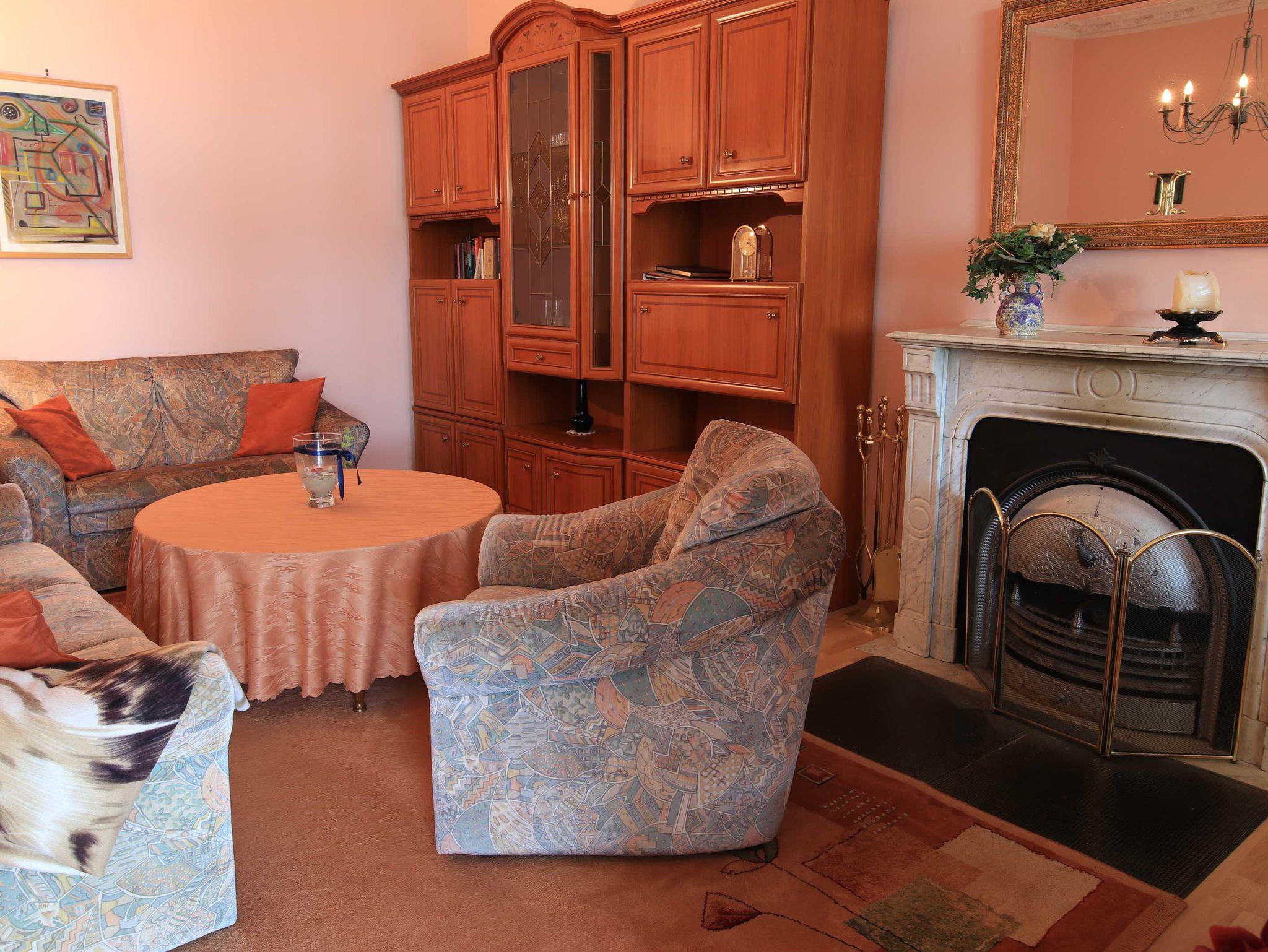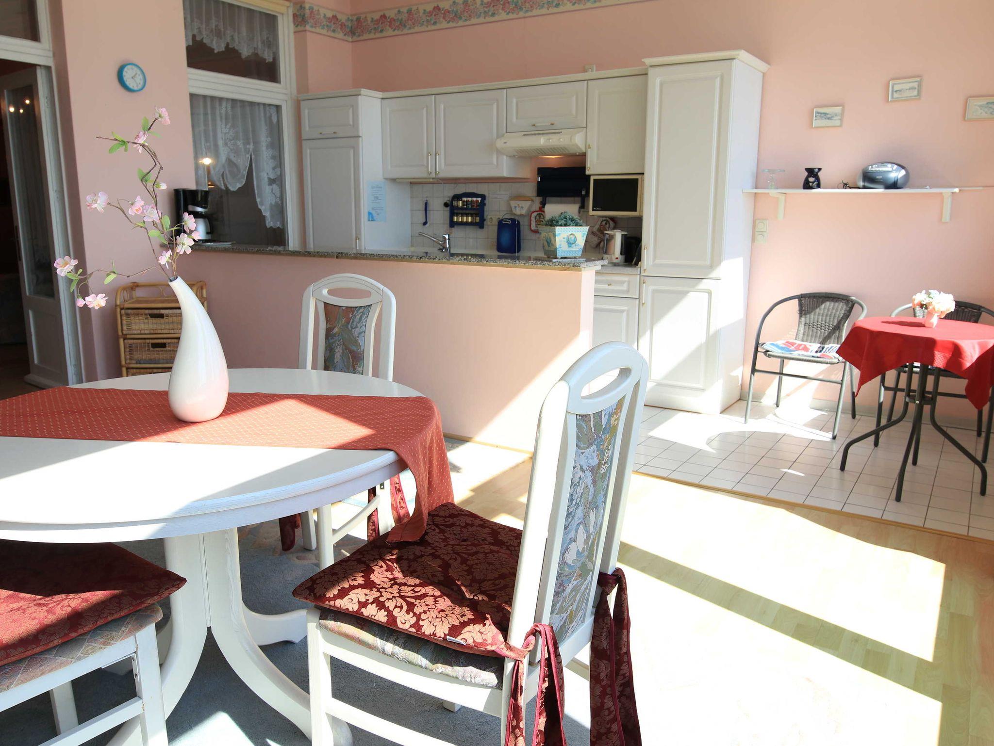 Die 68m² Ferienwohnung ist offen gestaltet mit einem Wohn- und Schlafbereich mit Doppelbett, dekorativem Kamin (stillgelegt), Schlafcouch, Flachbild-TV und Decken aus Stuck und einem Esszimmerbereich mit offener Küche samt Küchenausstattung (Kühlschrank, Ceranherd mit Backofen, Mikrowelle, Kaffeemaschine und Toaster). In das Badezimmer mit Dusche und WC gelangt der Gast über eine Treppe in die untere Etage (Kellergeschoss). Die großen Freitreppe, welche vom Esszimmerbereich zu erreichen ist, führt in den Garten. Im Garten stehen im Sommer Terrassenmöbel zur Nutzung zur Verfügung.