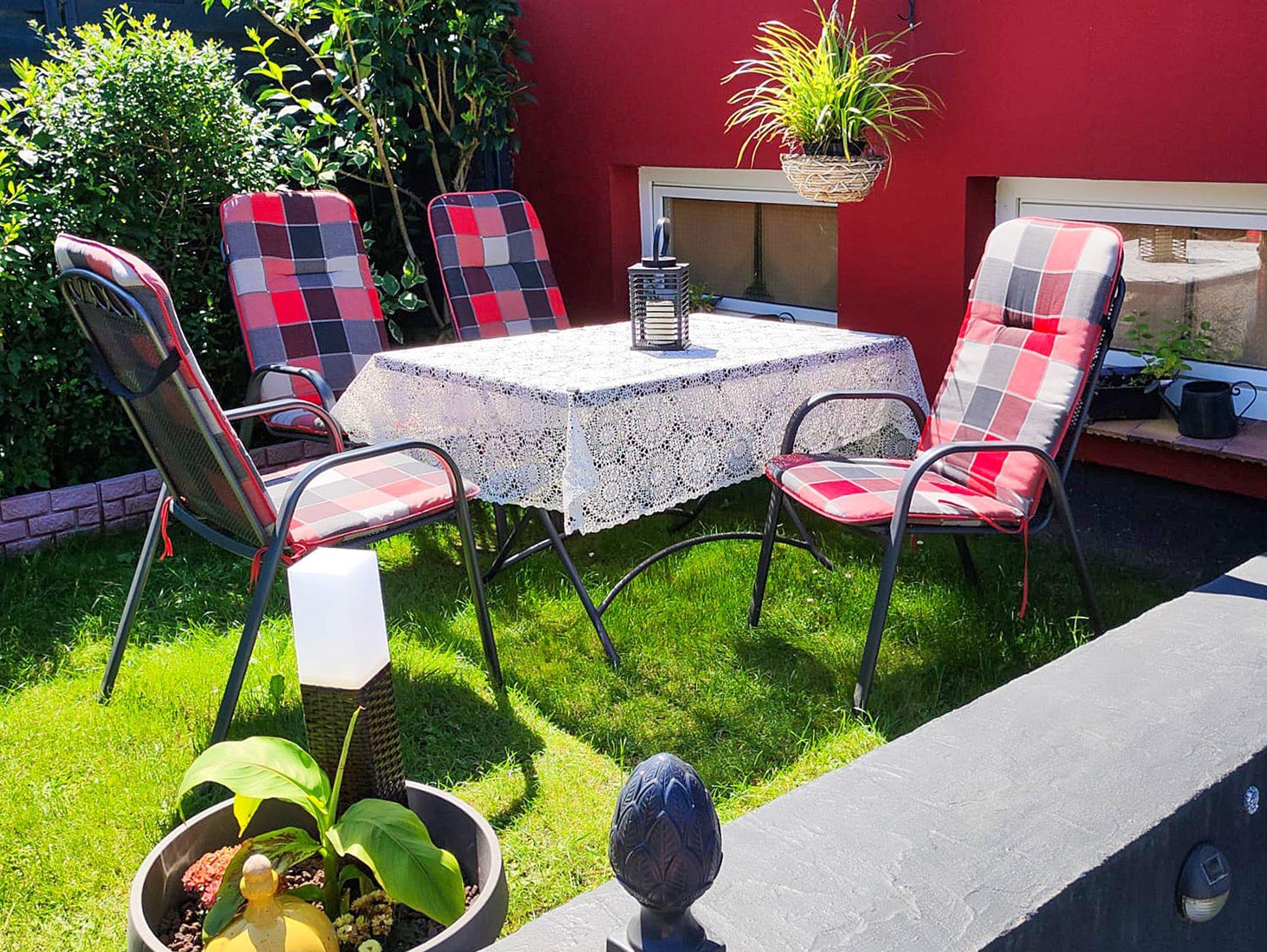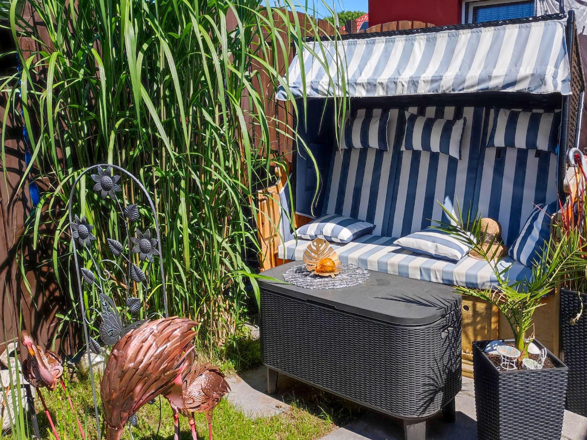 - Vor dem Feriendomizil ist ein hübsch dekorierter Garten mit möblierter Terrasse. Eine Hollywoodschaukel, Tisch/Stühle, Grill sowie ein Strandkorb nicht zur Verfügung.