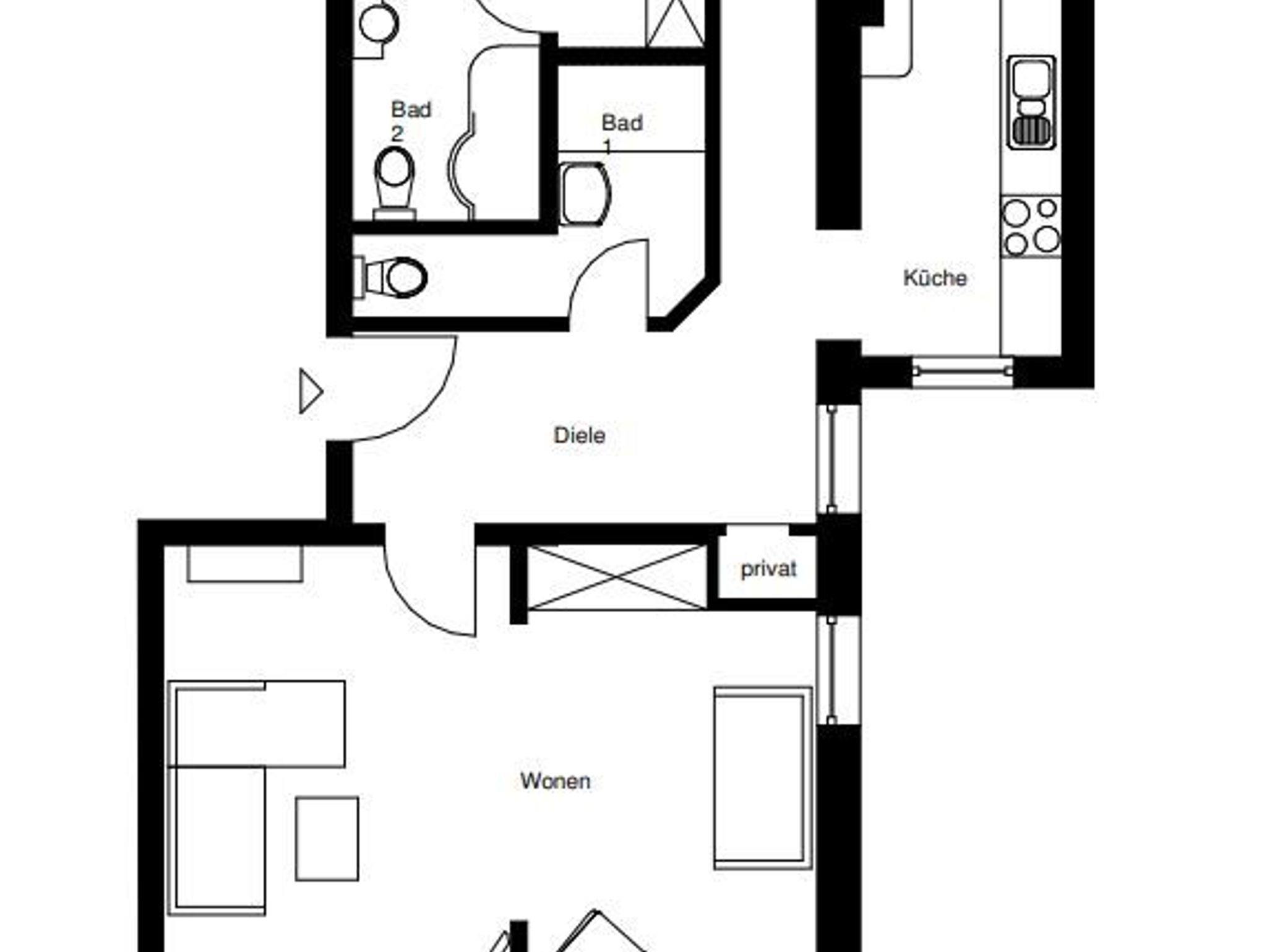? Des Weiteren befinden sich in der Wohnung ein separates Duschbad/WC sowie eine Küche, beide von der Diele aus erreichbar.