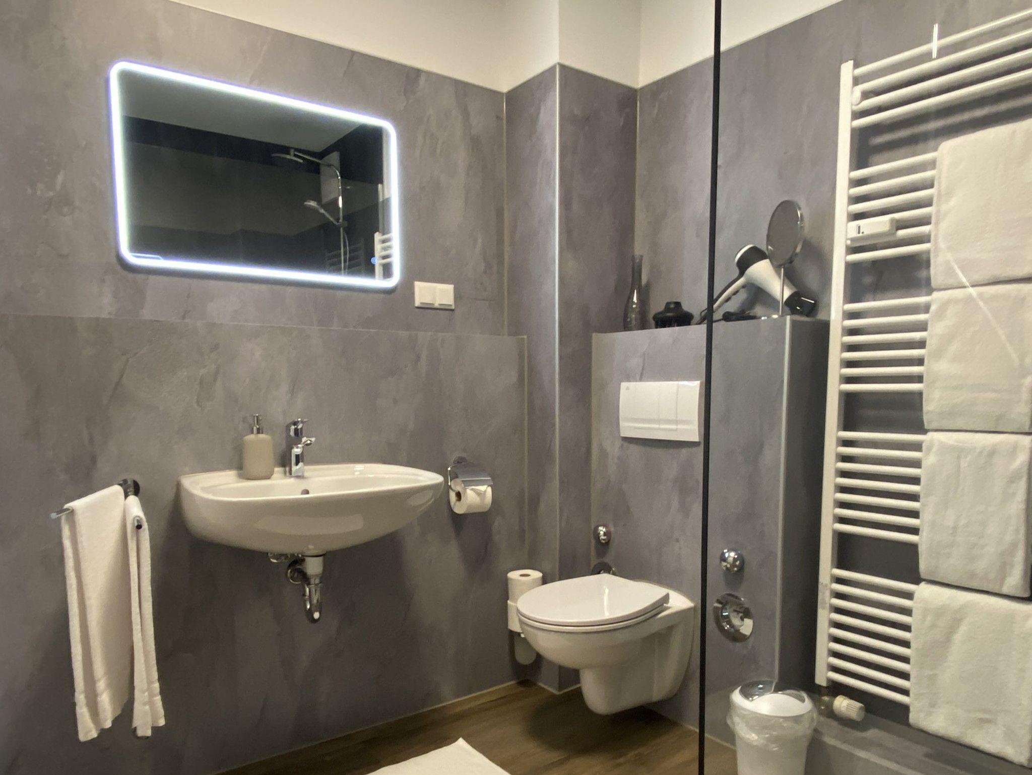 Flur und großzügiges Bad mit Regendusche.