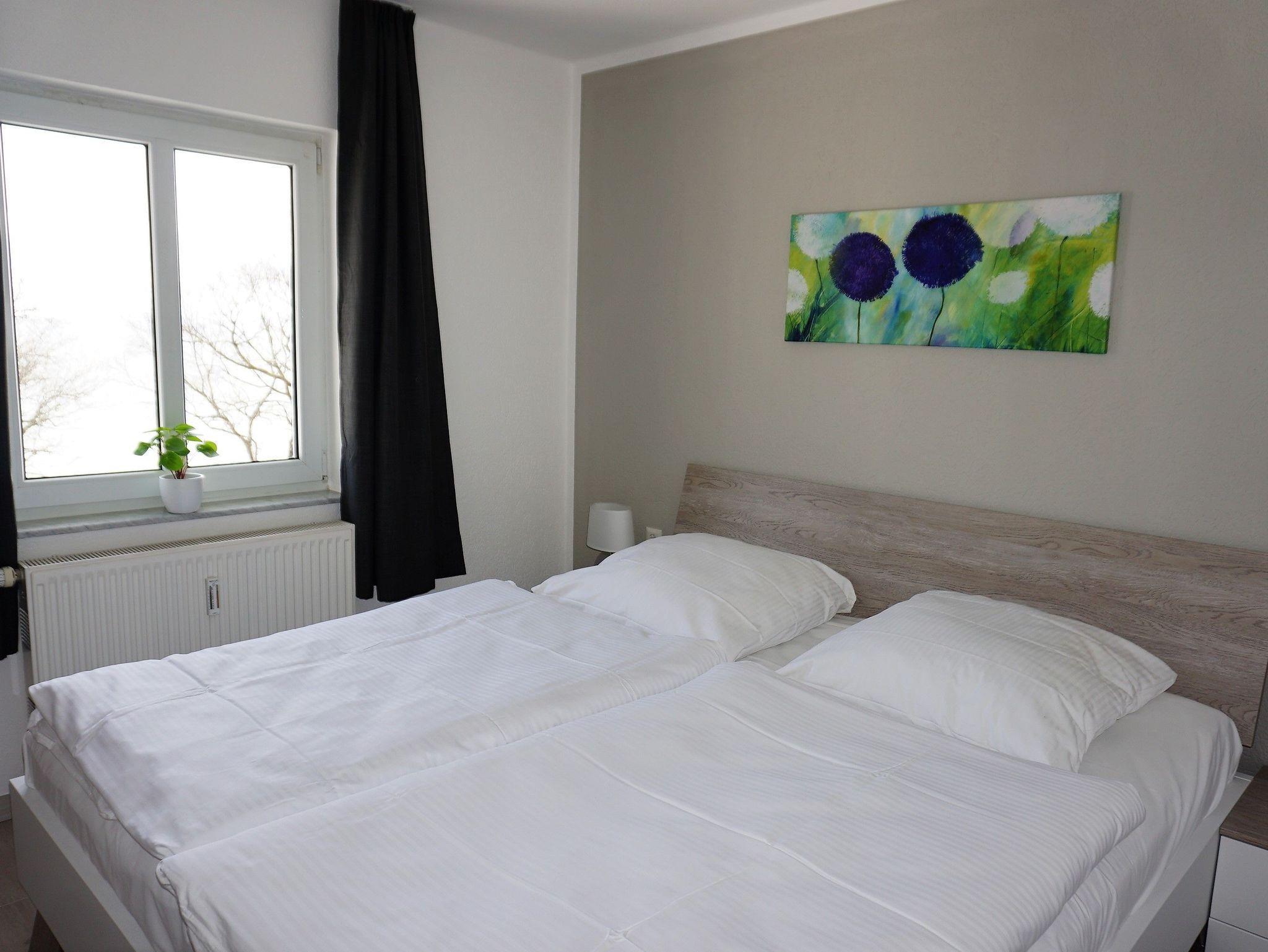 Das Schlafzimmer überzeugt mit einem bequemen Doppelbett. Verdunklungs-Vorhänge sorgen für einen ungestörten Schlaf - mit leisem Meeresrauschen.