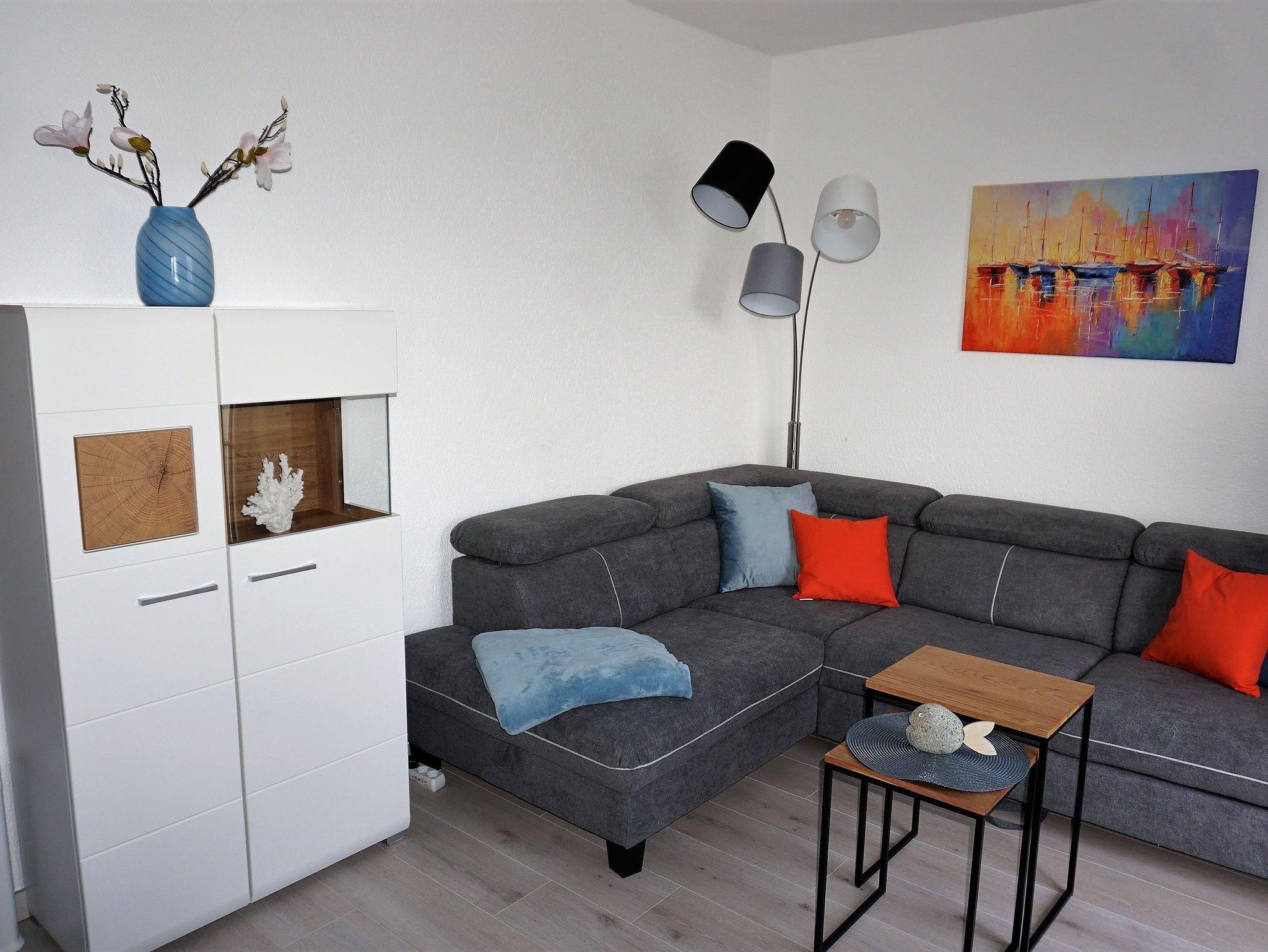 Die 2022 komplett renovierte und völlig neu eingerichtete Ferienwohnung verfügt über einen großzügigen Wohn-Essbereich - mit Sicht auf den liebevoll angelegten Garten und das Meer.