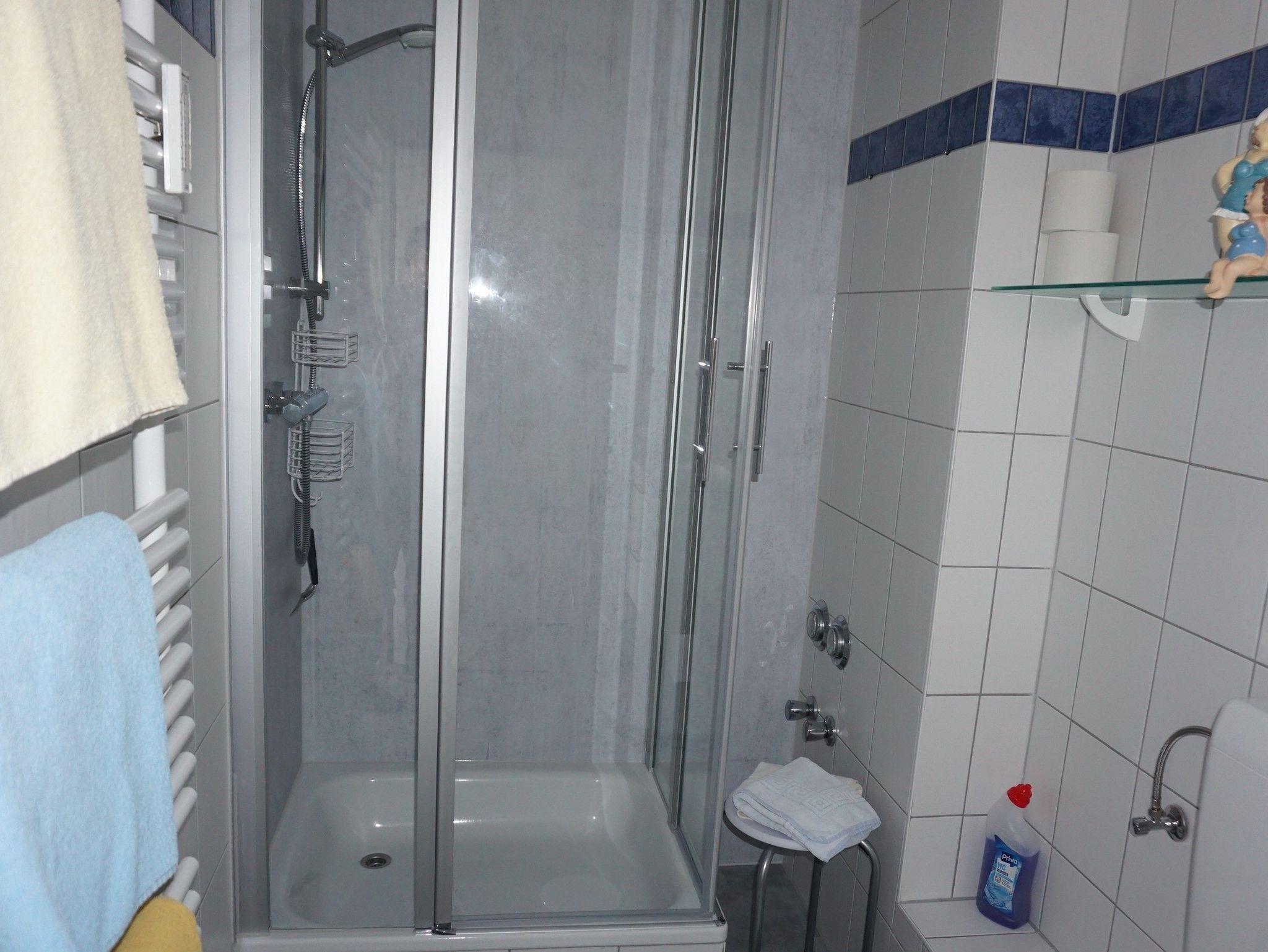 Das helle Badezimmer (ebenfalls renoviert) mit Dusche und WC begrüßt sie am Morgen mit angewärmten Handtüchern.