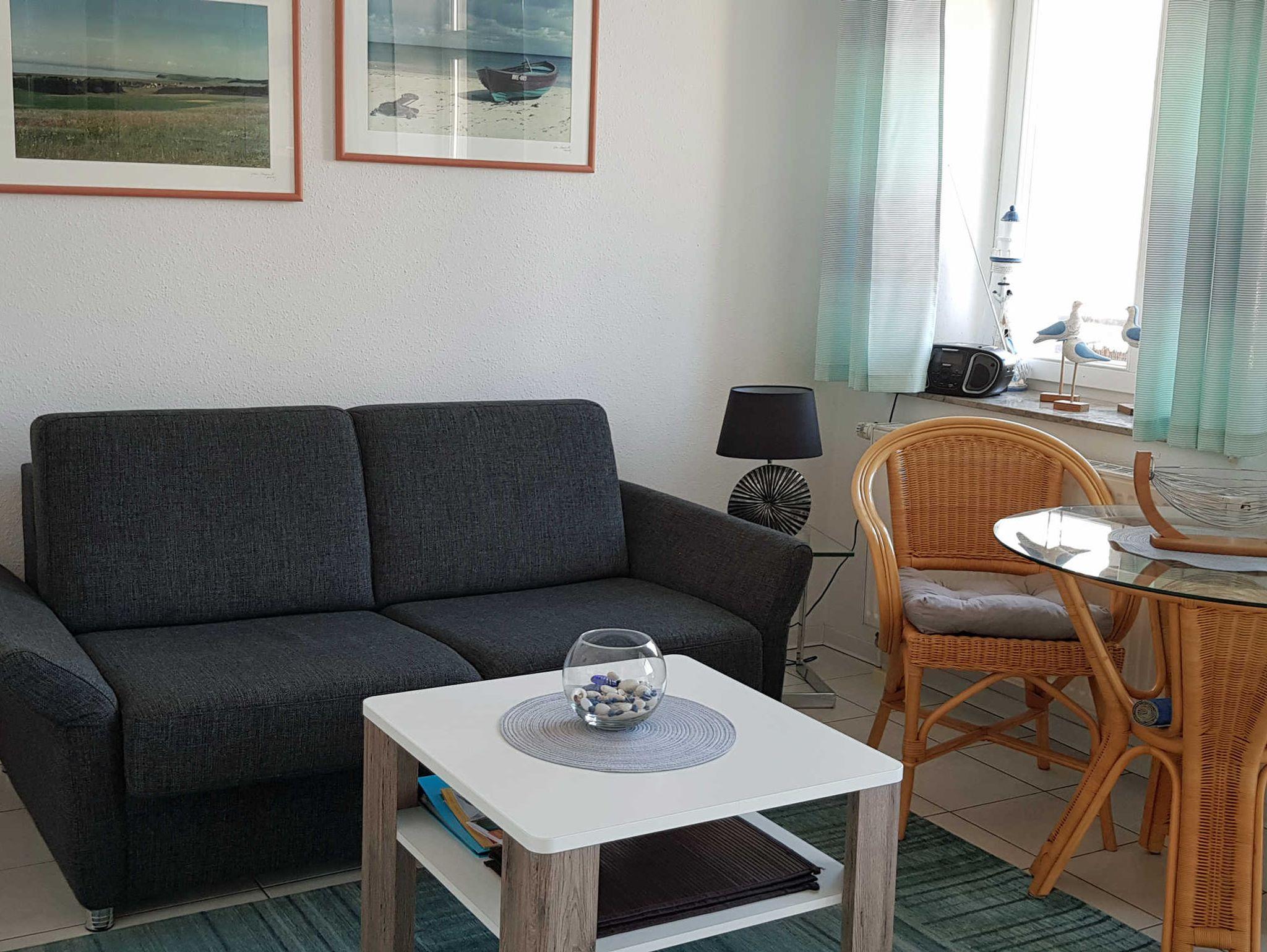 ? Im Wohnbereich steht ein Schlafsofa (Liegefläche 130x200cm), ein Esstisch mit 3 Rattansesseln, Flachbild-TV, WLAN und Radio.