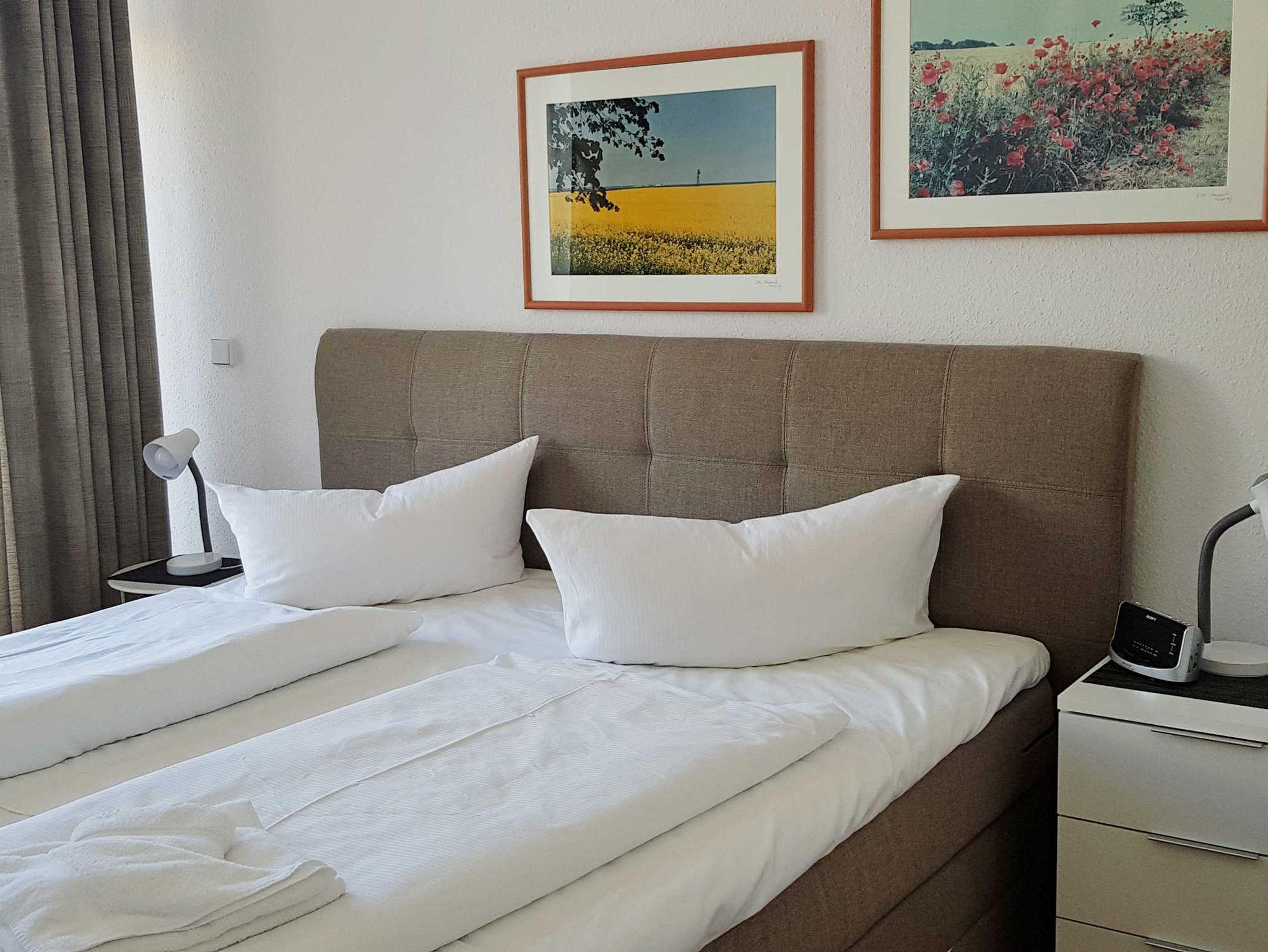? Das separate Schlafzimmer ist mit einem Boxspringbett (1,80 x 2,00 m), Nachttischen und Kleiderschrank ausgestattet.
