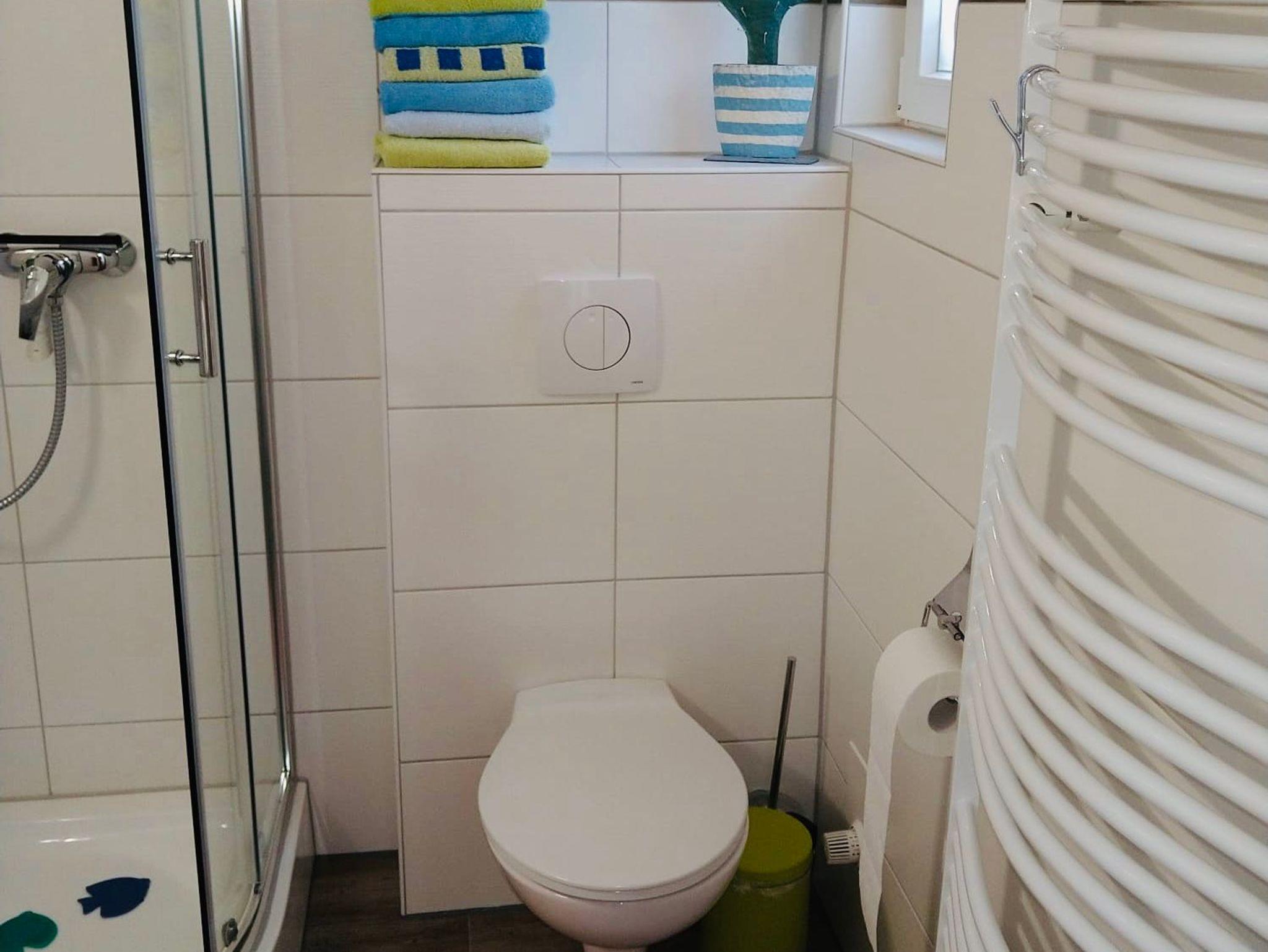 ? Badezimmer mit Dusche, WC, Fön und Handtuchwärmer.