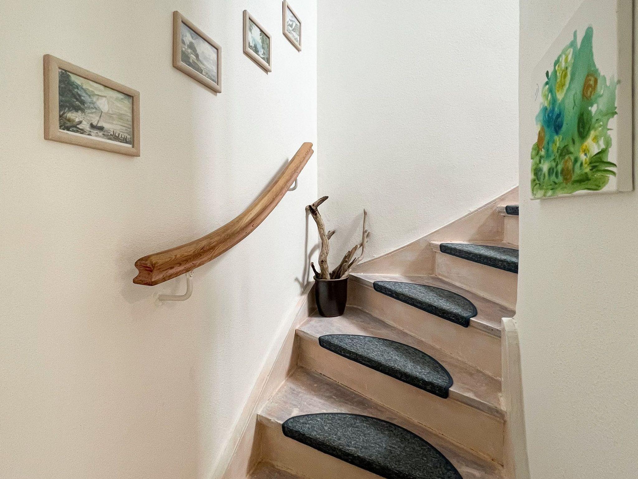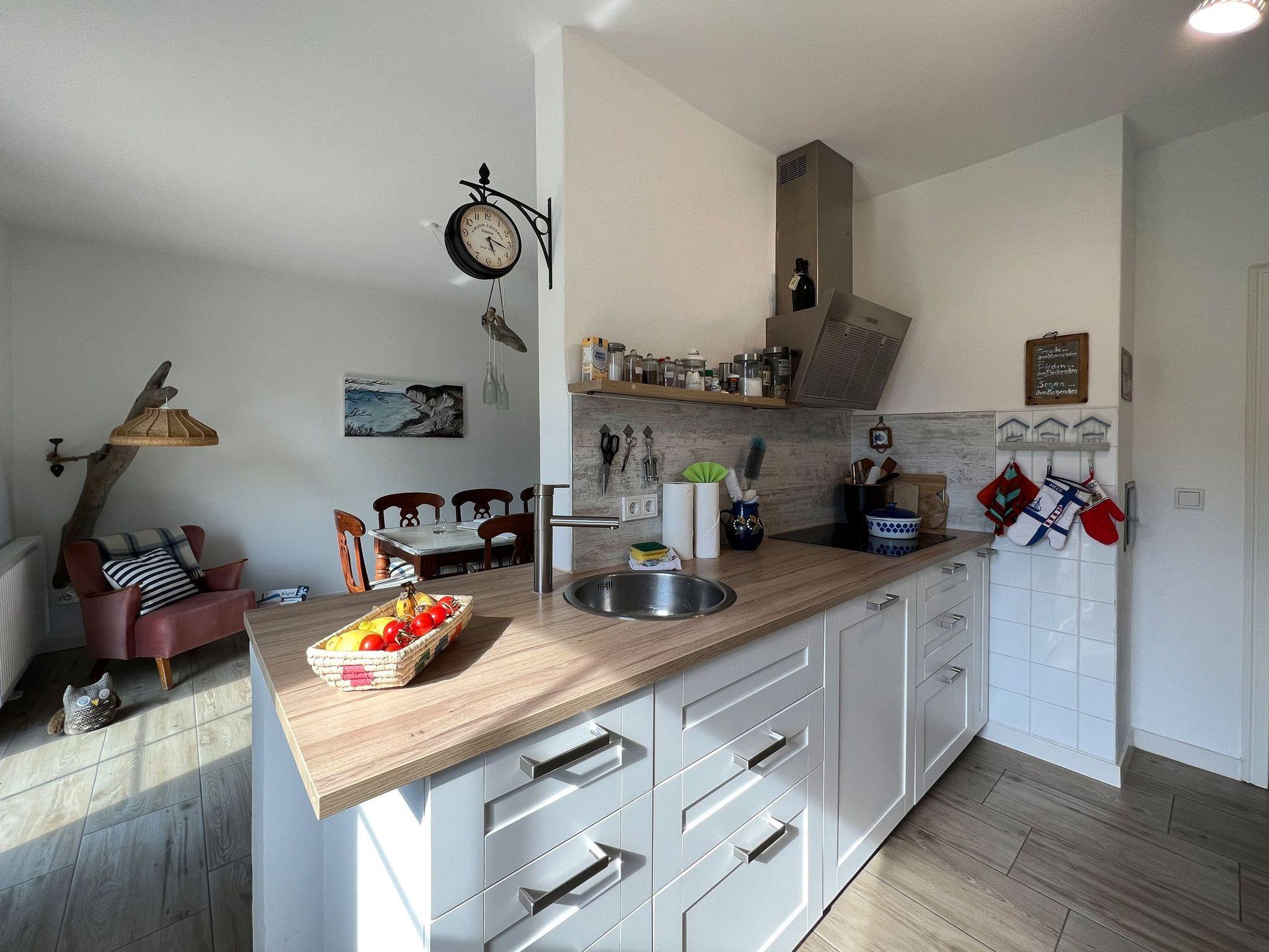 Die moderne, 2019 eingebaute Einbauküche umfasst einen Geschirrspüler, eine Mikrowelle mit Grillfunktion, ein Cerankochfeld mit vier variablen Kochfeldern und Dunstabzug, sowie einen Kühlschrank mit Gefrierfach. Zur Küchenausstattung gehören auch eine Kaffeemaschine, 2 zusätzliche Kaffeebereiter, Toaster, Wasserkocher, sowie umfangreiche weitere Küchenutensilien, Besteck und Geschirr für mindestens 9 Personen.