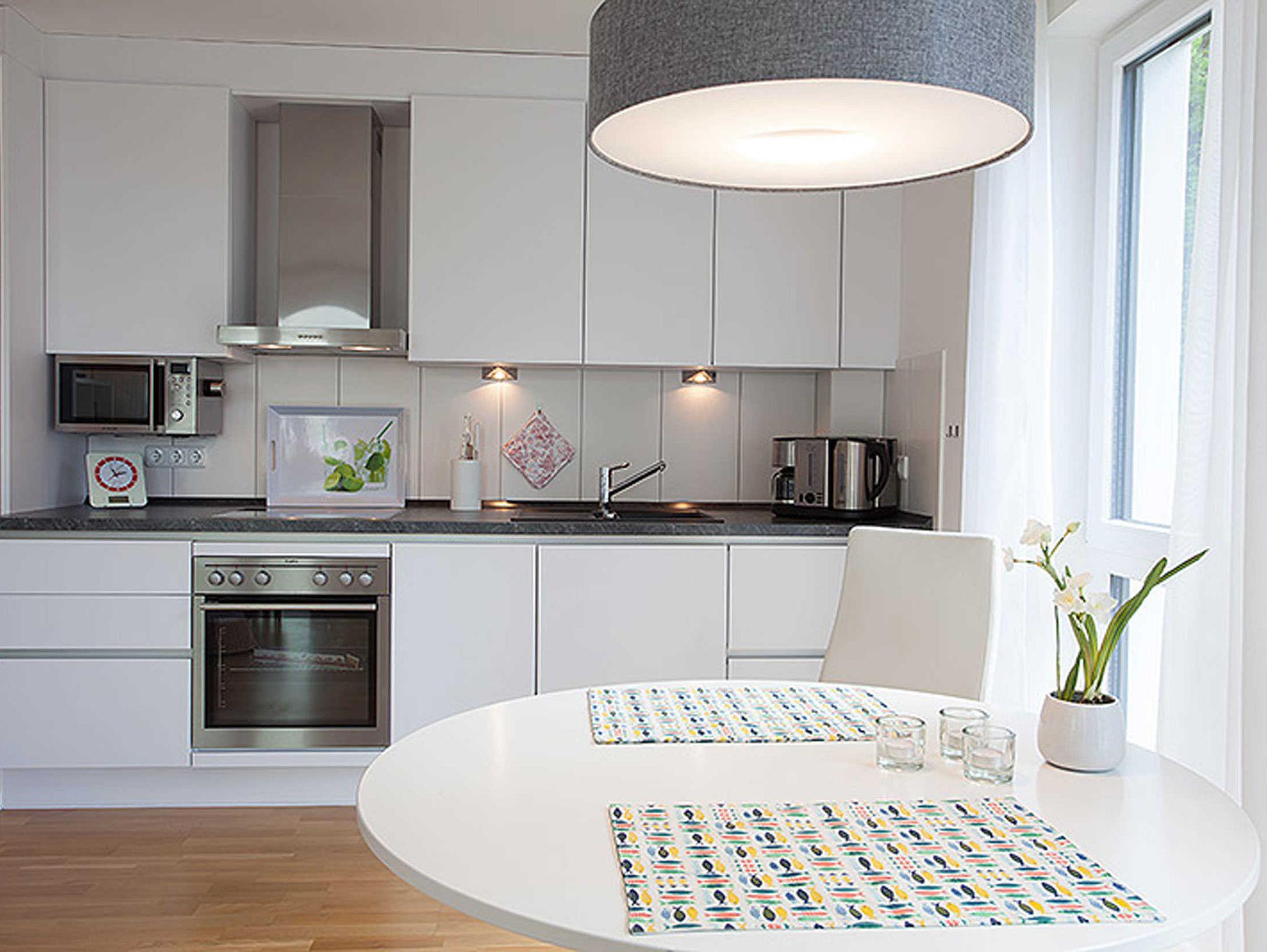 ? offener, komfortabel ausgestatteter Küchenbereich (E-Herd, Backofen, Mikrowelle, Geschirrspüler)