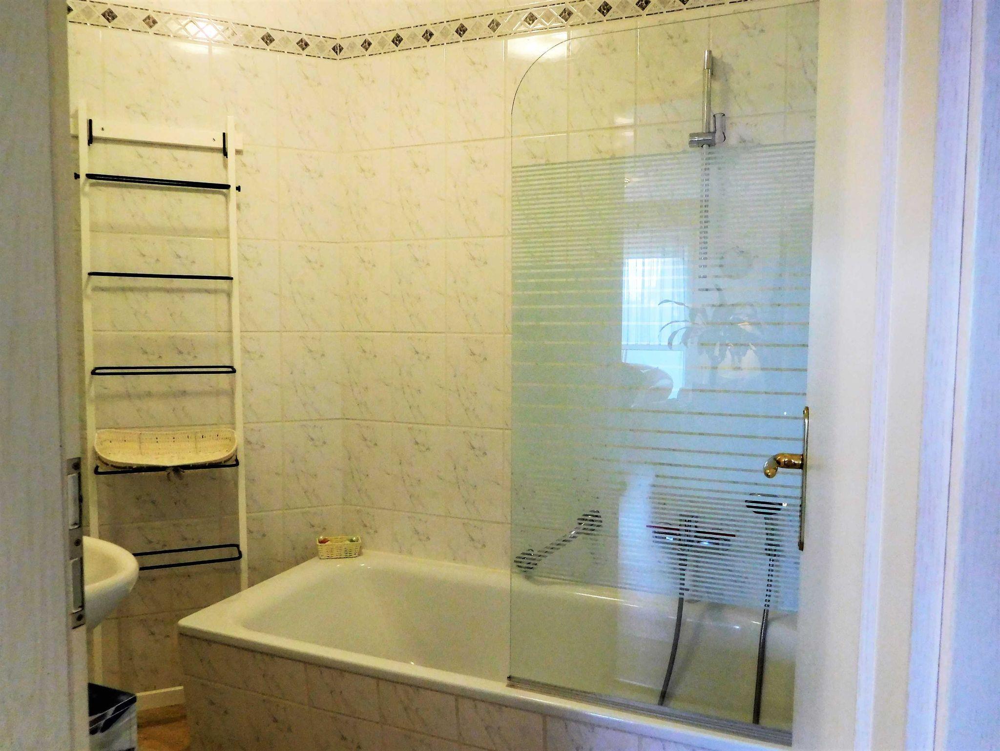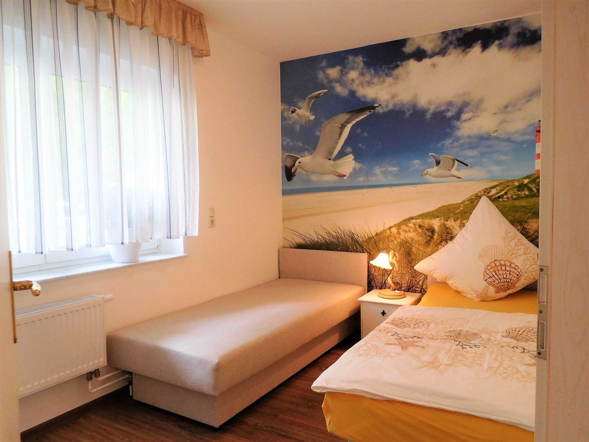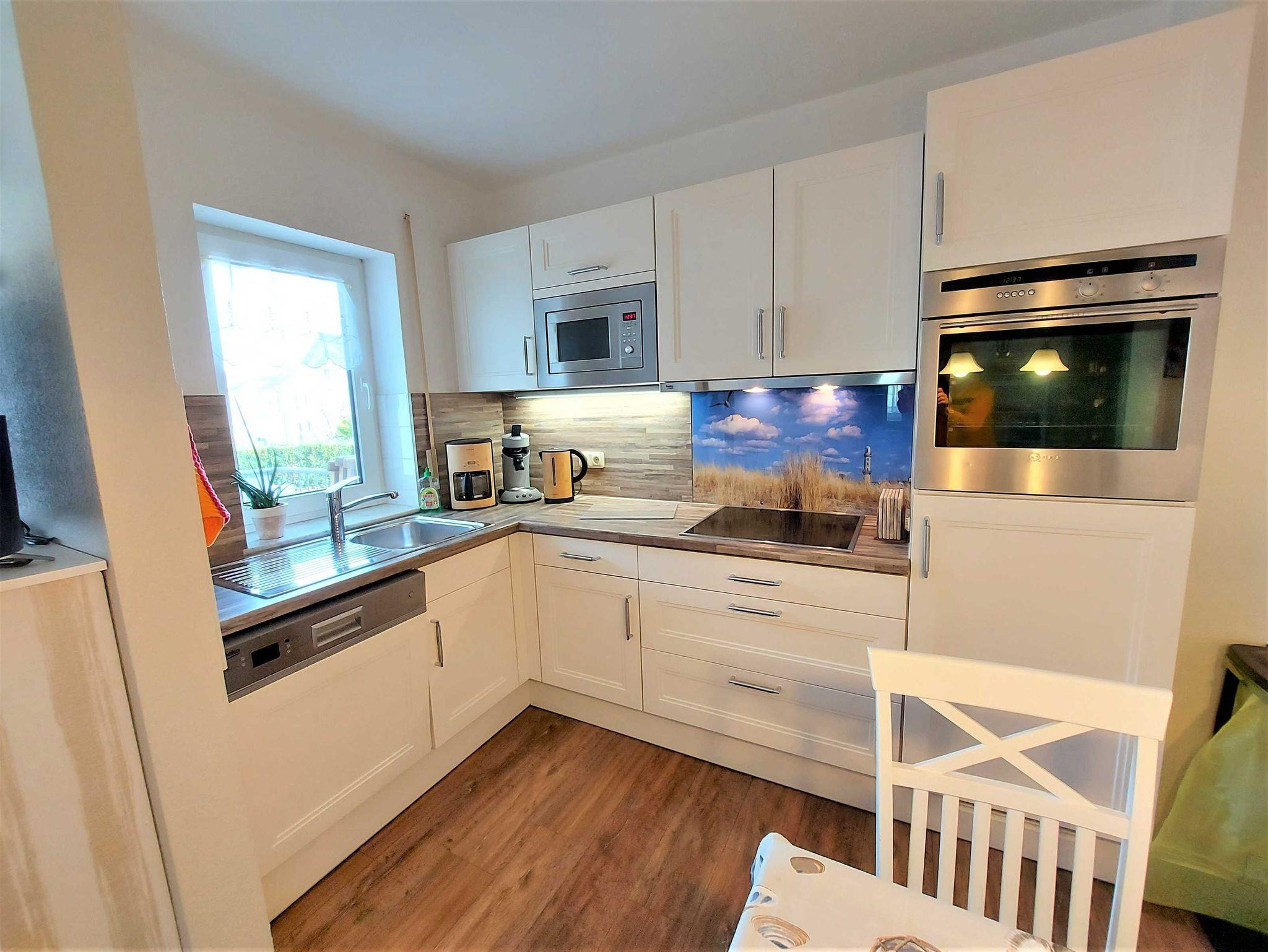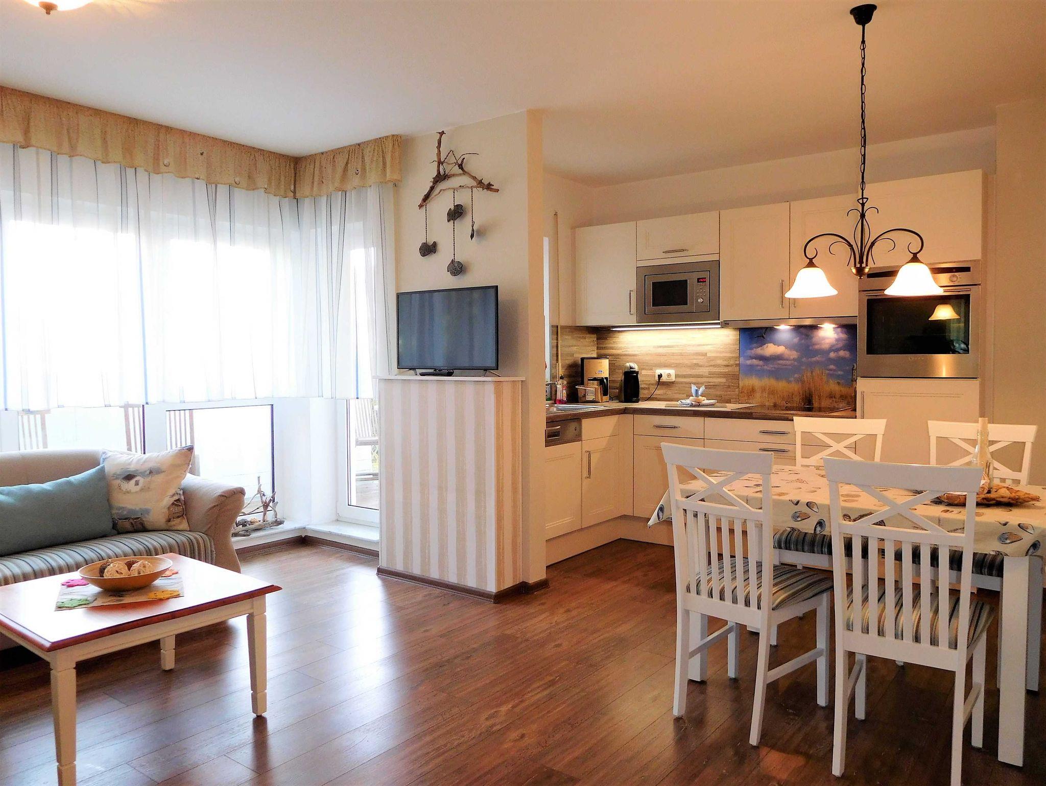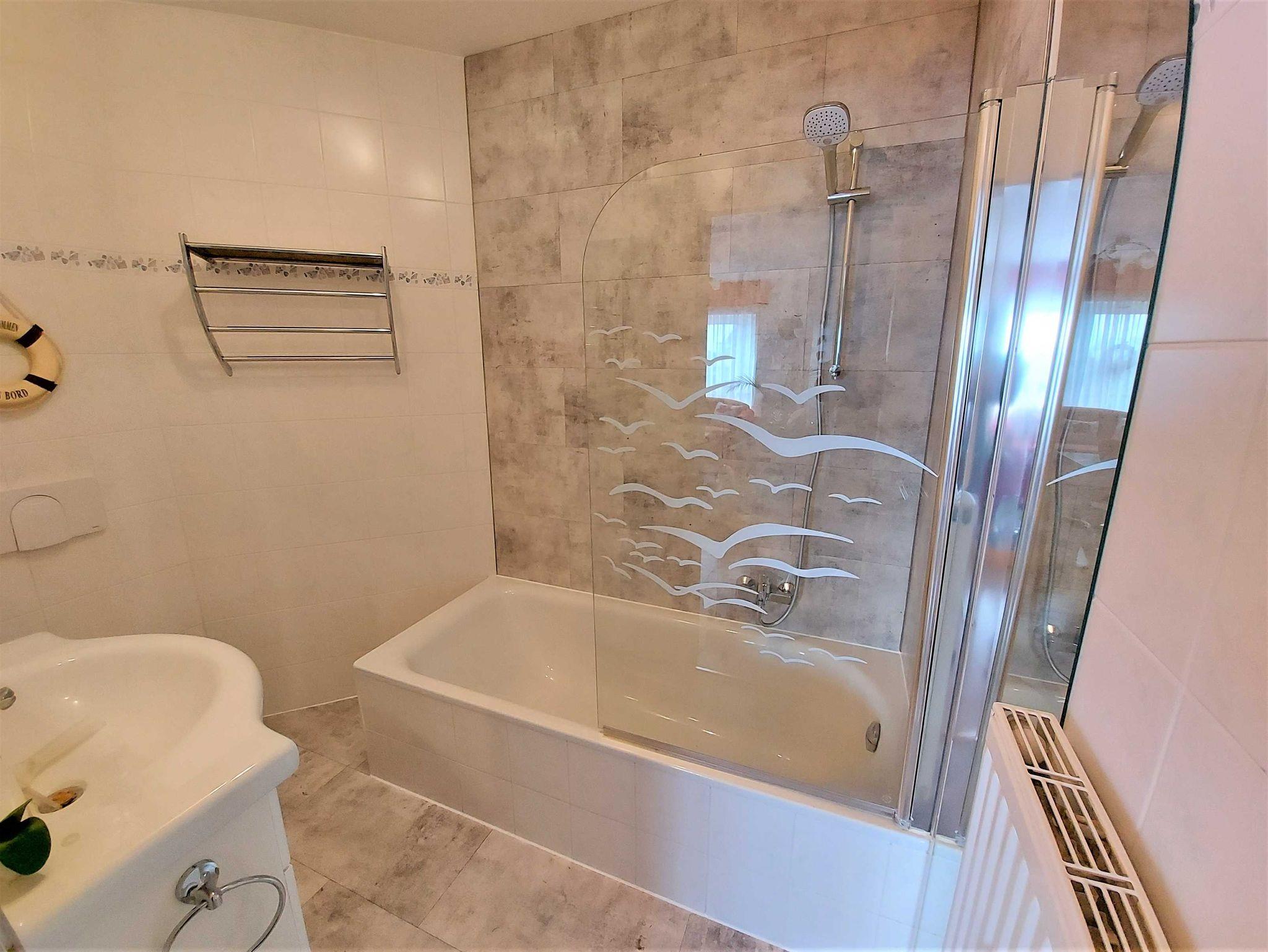 eines gepflegten Apartmenthauses in ruhiger Lage aber sehr Zentral. Sie verfügt über einen großen lichtdurchfluteten Wohnraum mit 2 gemütlichen Sofas und einem Sessel, die zum Sat.- Fernsehen oder zum Musikhören einladen oder gehen sie von hier auf den Balkon mit schönen Holzmöbeln, Sitzkissen und Sonnenschirm und geniessen z Bsp leckeren Fisch, den sie gerade am Hafen direkt vom Fischer geholt haben und in der kompletten Einbauküche mit allem Komfort , wie Geschirrspüler, Mikrowelle, Ceranfeld, Kühl-Gefrierkombi usw mit Freude zubereiten können. Angrenzend ist der Esstisch mit 4 gemütlichen Stühlen.Die Nacht geniessen sie im grosszügigen Schlafzimmer mit Doppelbett und 2. Balkon und im zweiten Schlafzimmer mit 2 Einzelbetten. Im Bad erwartet sie zum Entspannen eine Wanne. Auch ihr Auto hat einen eigenen PKW-Stellplatz auf dem Hof. Fahrradständer vorhanden. Bettwäsche inklusive. Handtücher bitte selbst mitbringen. Gemeinschaftswaschmaschine im Keller.