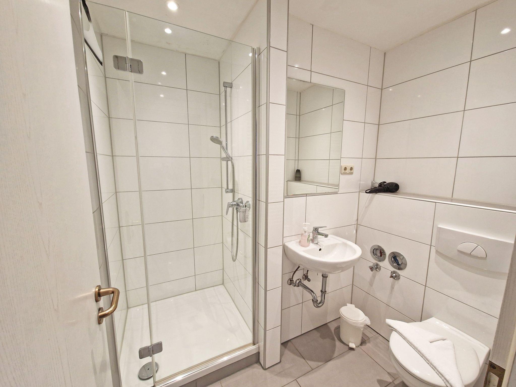 ? Ein Badezimmer mit Dusche/ WC und Fön
