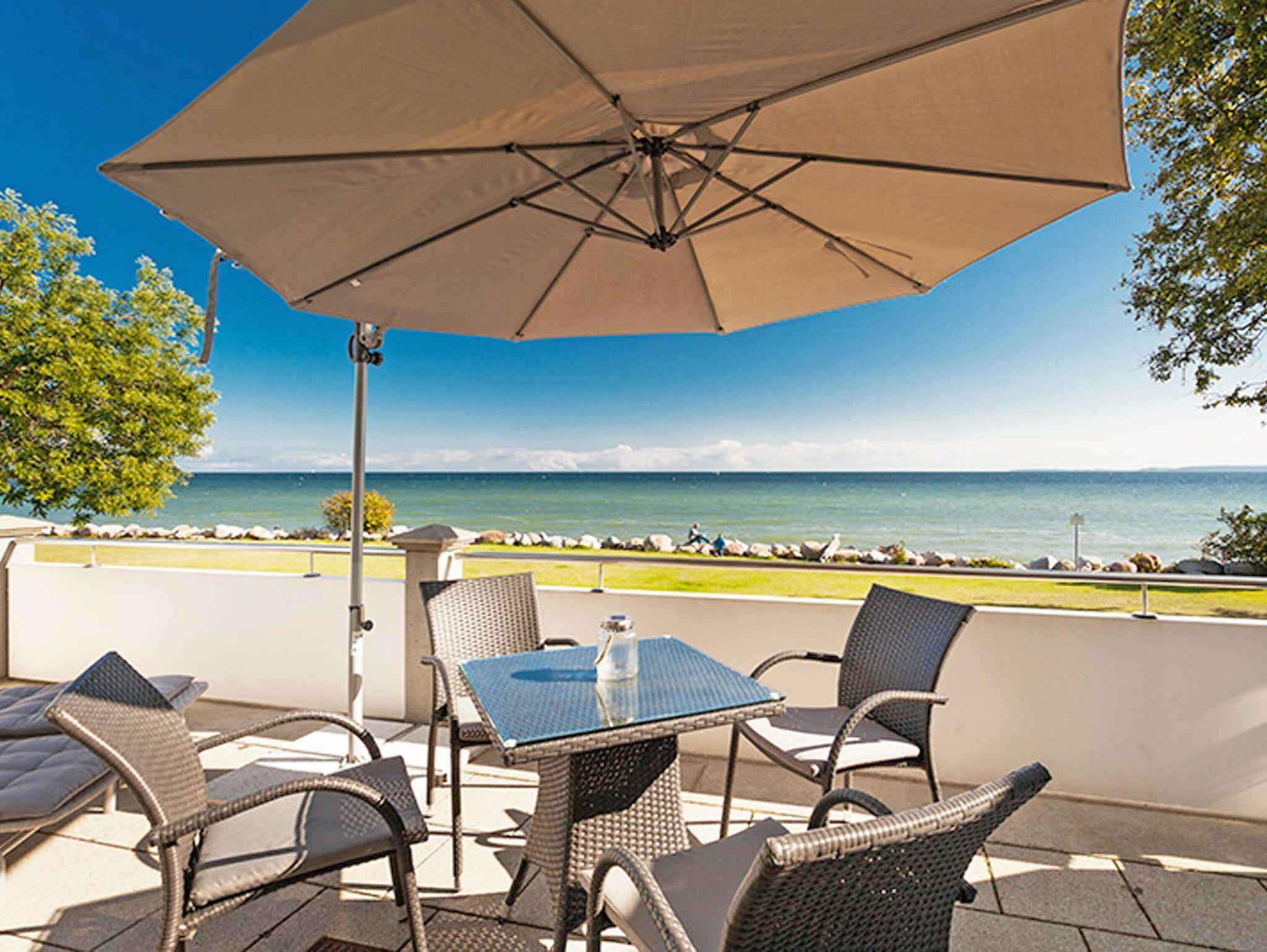 ? Terrasse, nach Süden ausgerichtet und grandiosen Sonnenaufgängen, Meerblick und Meeresrauschen. Die Balkon- bzw. Terrassenmöbel stehen saisonal - in der Regel von Mai bis Ende September - zur Verfügung.