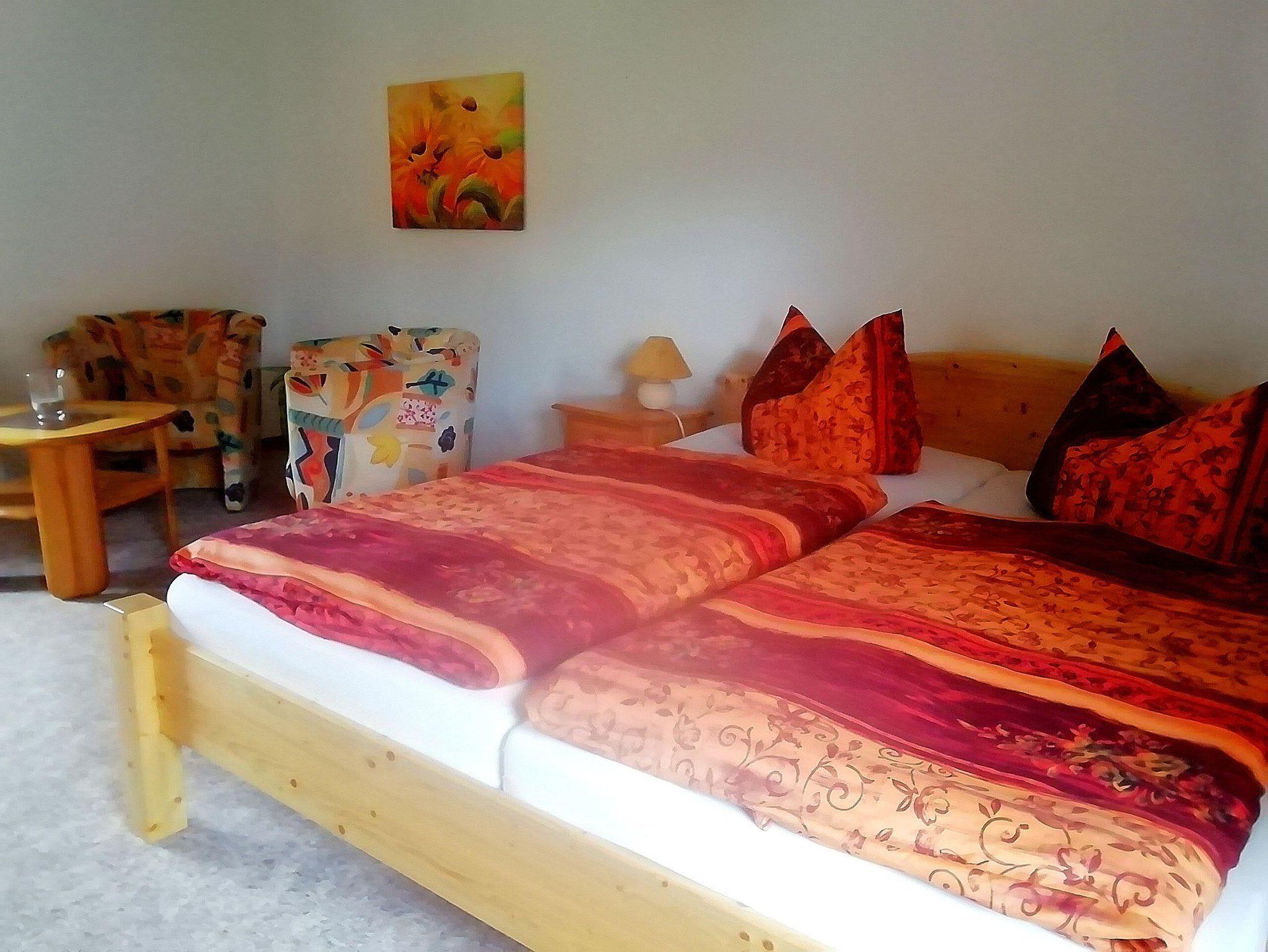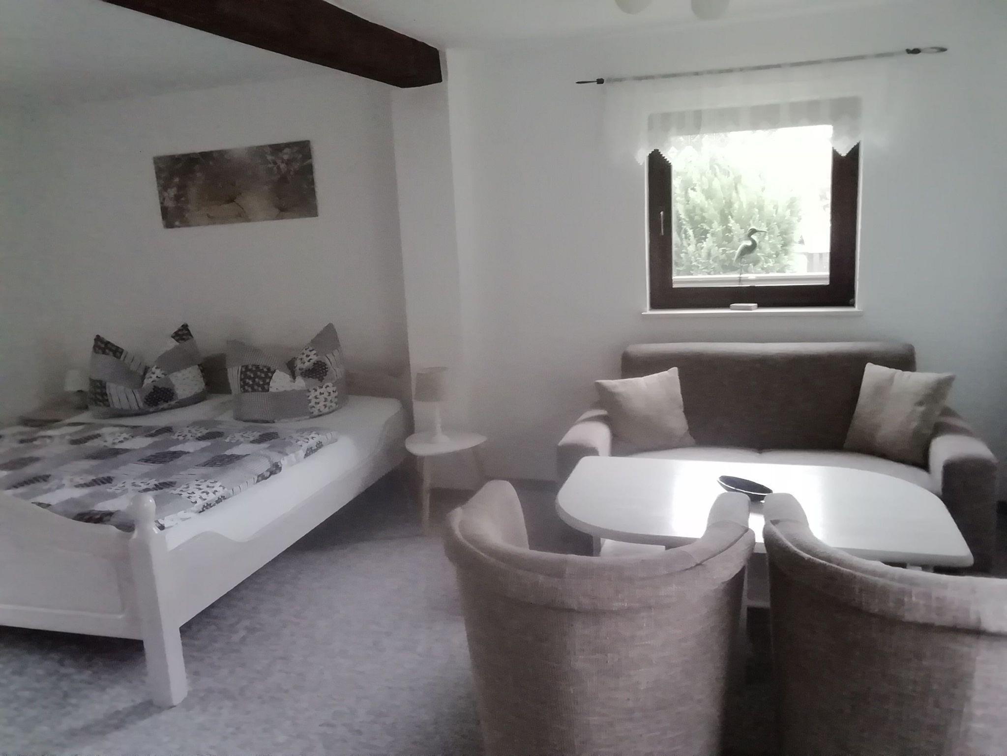 Das Ferienhaus liegt separat auf dem Grundstück. Es hat eine Größe von 60 qm und ist ebenerdig. 2 komb. Wohn/Schlafräume mit Doppelbetten und Sitzecke, TV, Radio, 1 DU/WC und eine Küche. DasFerienhaus eignet sich für max. 4 Personen.