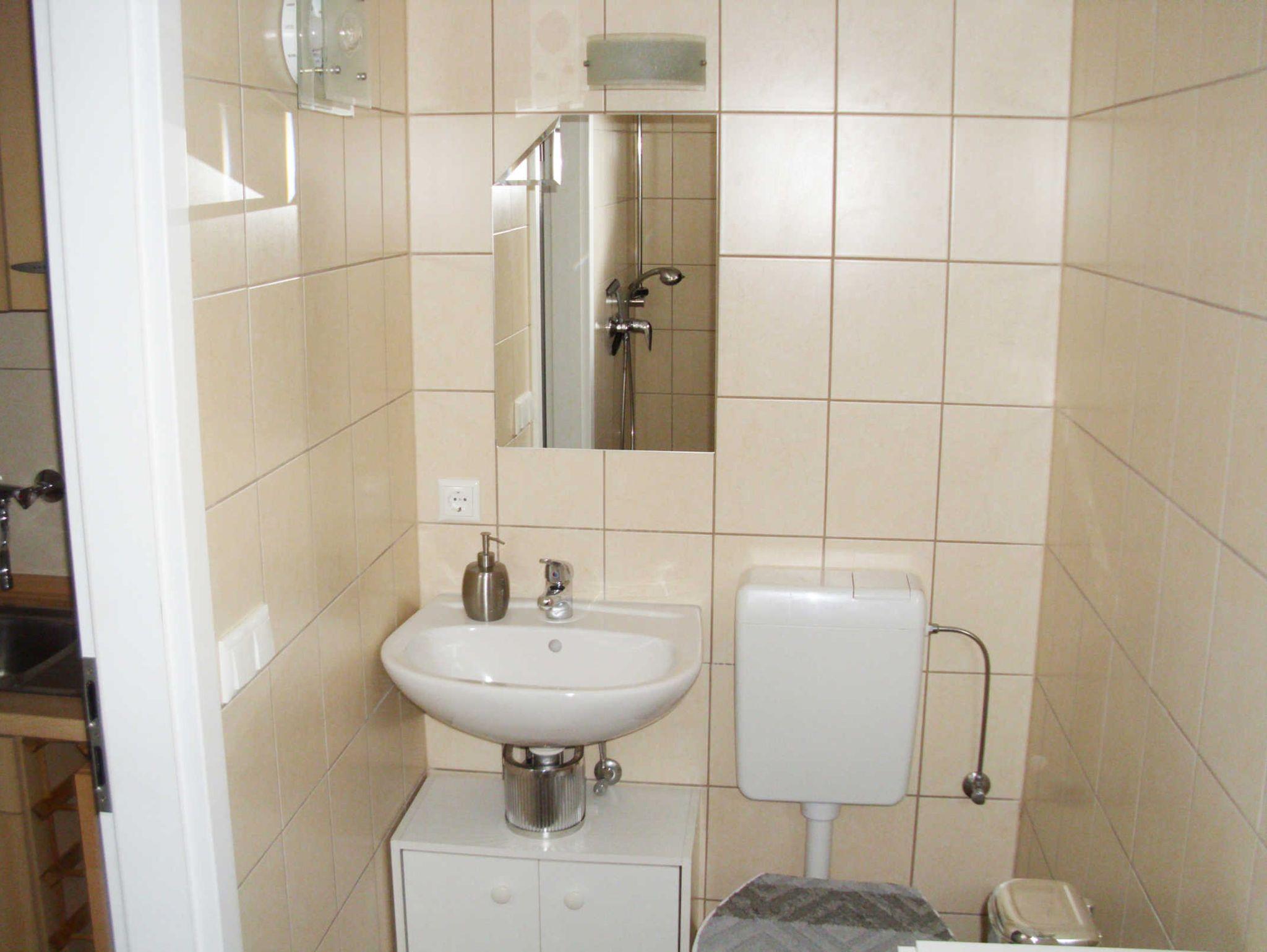 Bad mit ebenerdiger Dusche, Waschtisch und WC