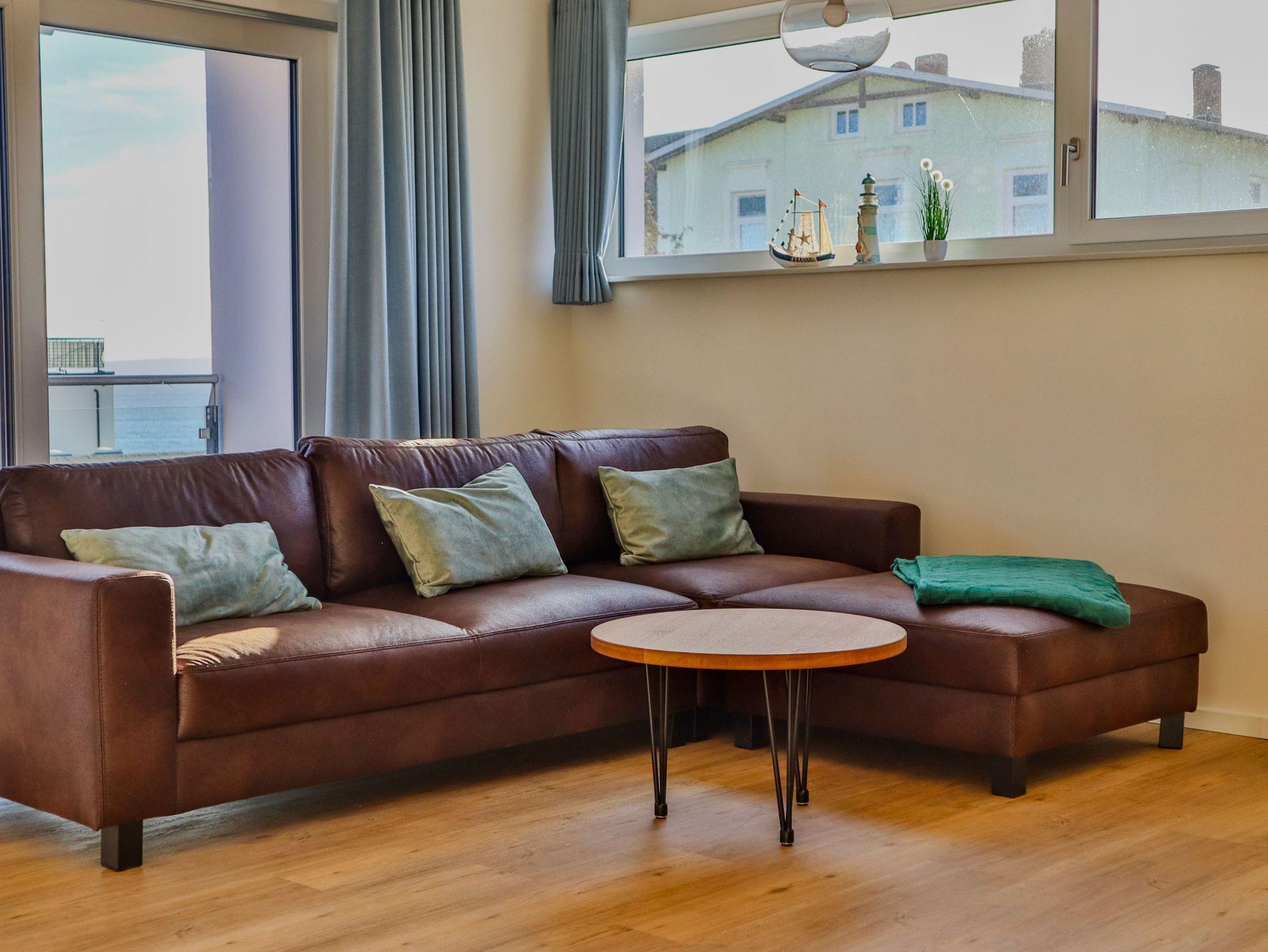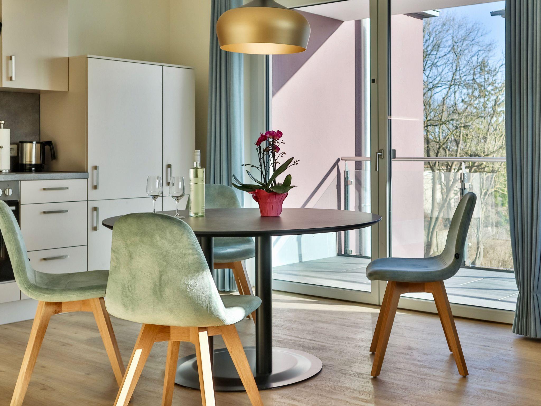Darüber hinaus gibt es einen hellen Wohnraum mit Küche, Loungebereich und Esstisch sowie einem großen Süd-Balkon bzw. Terrasse, um die Ostseeluft zu genießen. Gerne stellen wir Ihnen ein Kinderbett und einen Hochstuhl zur Verfügung.