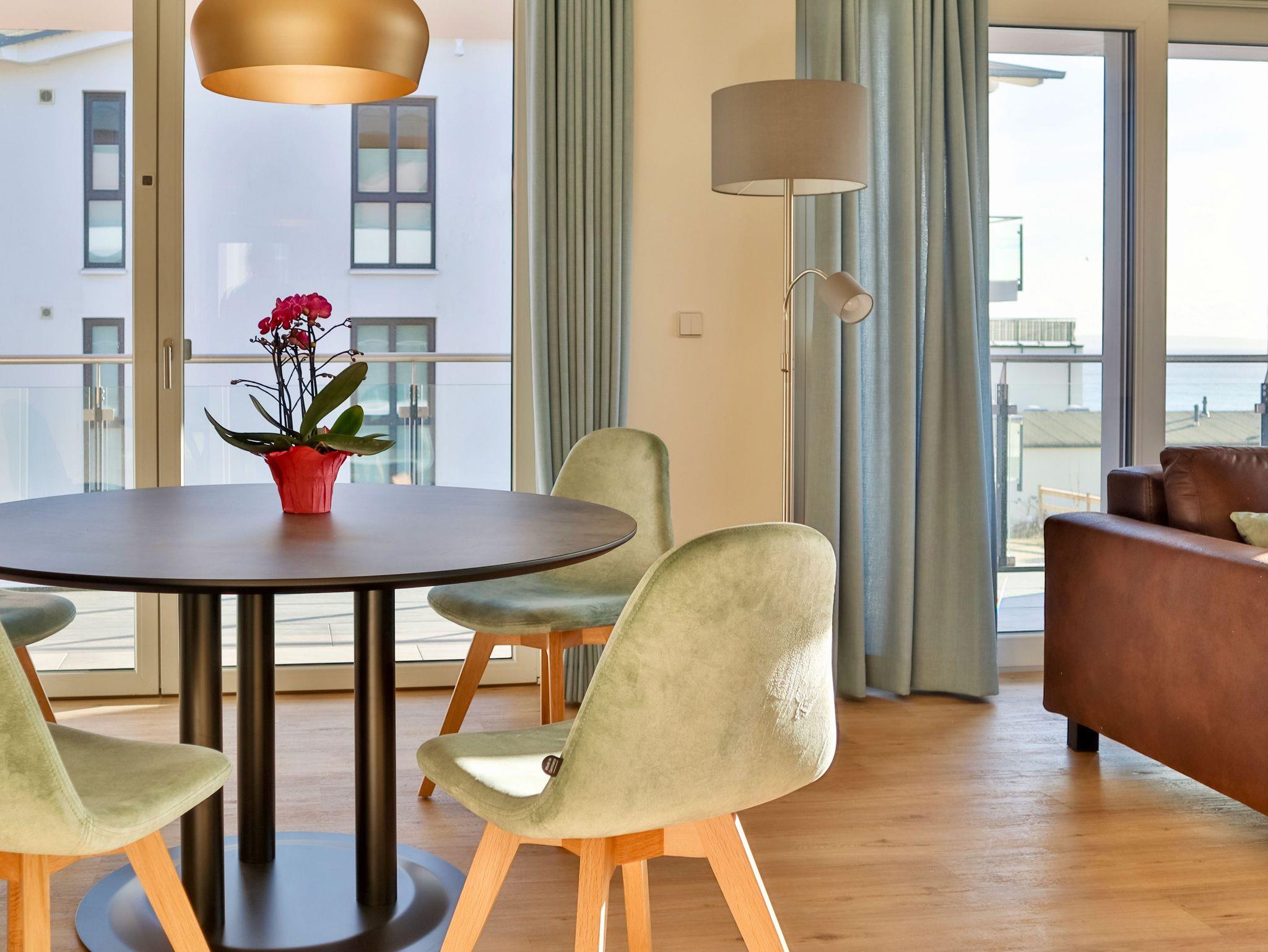 Ausgezeichneten Schlafkomfort bieten in allen Appartements Hotelbetten mit hochwertigen orthopädischen Matratzen. In allen Räumen beeindruckt das offene Wohnkonzept, dass harmonisch auf die Einrichtung abgestimmt und durch ausgewählte Bilder und Kunstobjekte unterstrichen wird.
