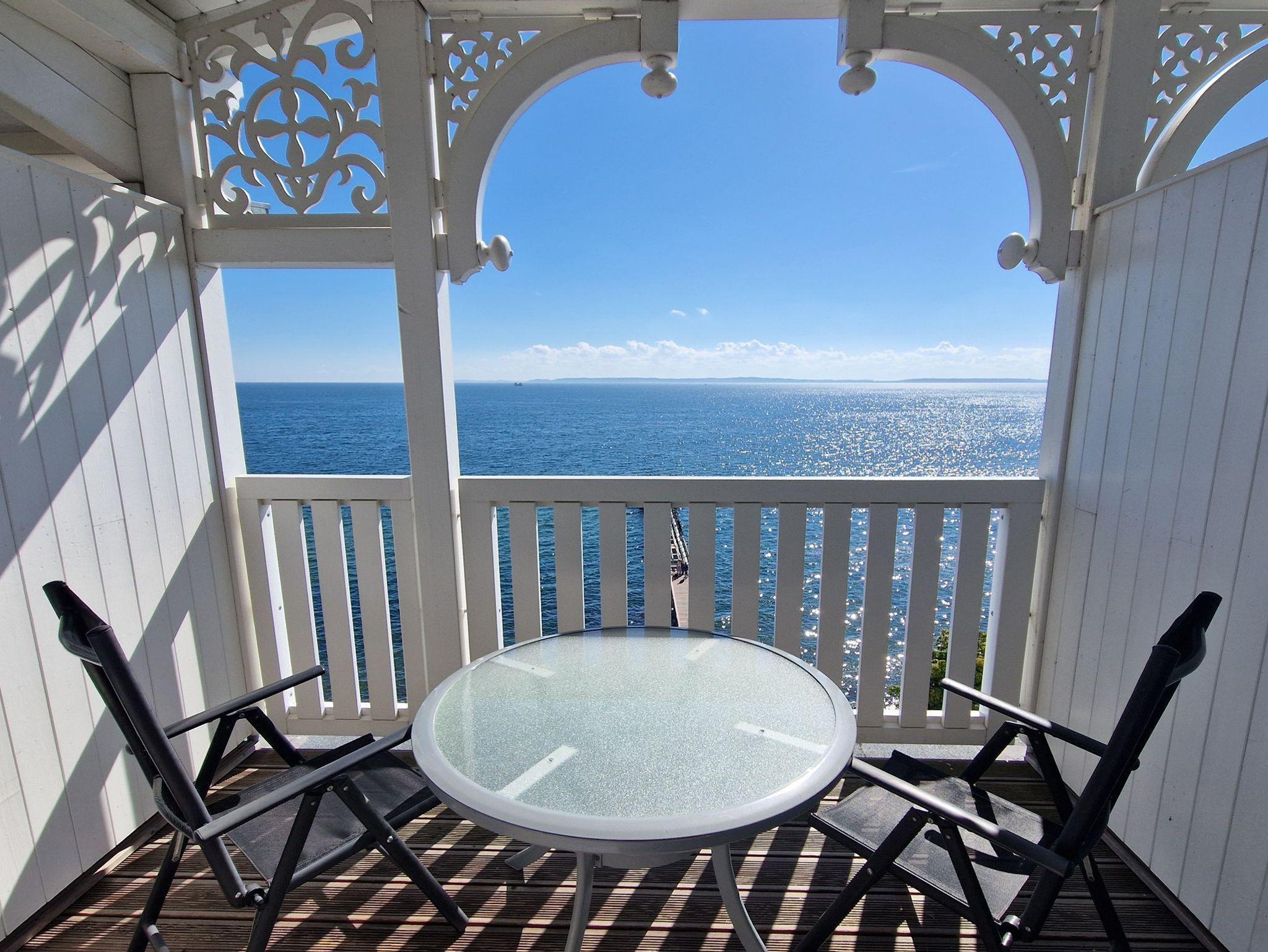 Sie genießen einen wunderschönen Seeblick, sehen Fährschiffe und Fischerboote vorbeiziehen und haben einen Weitblick bis hin zu den Ostseebädern Binz und Sellin.