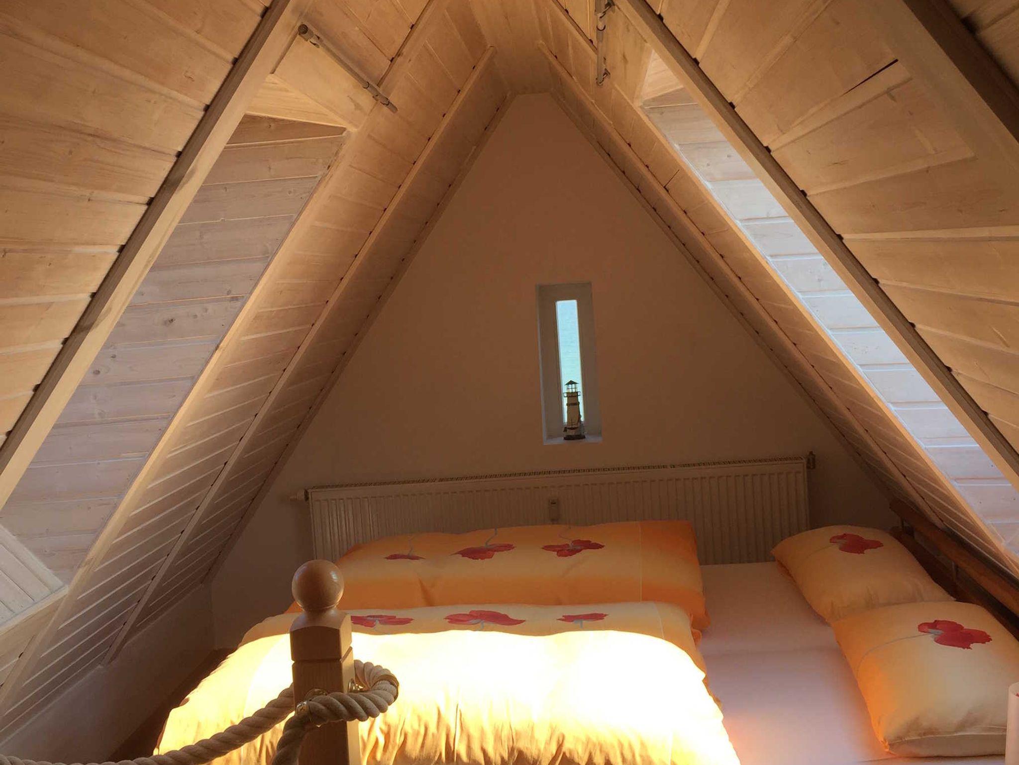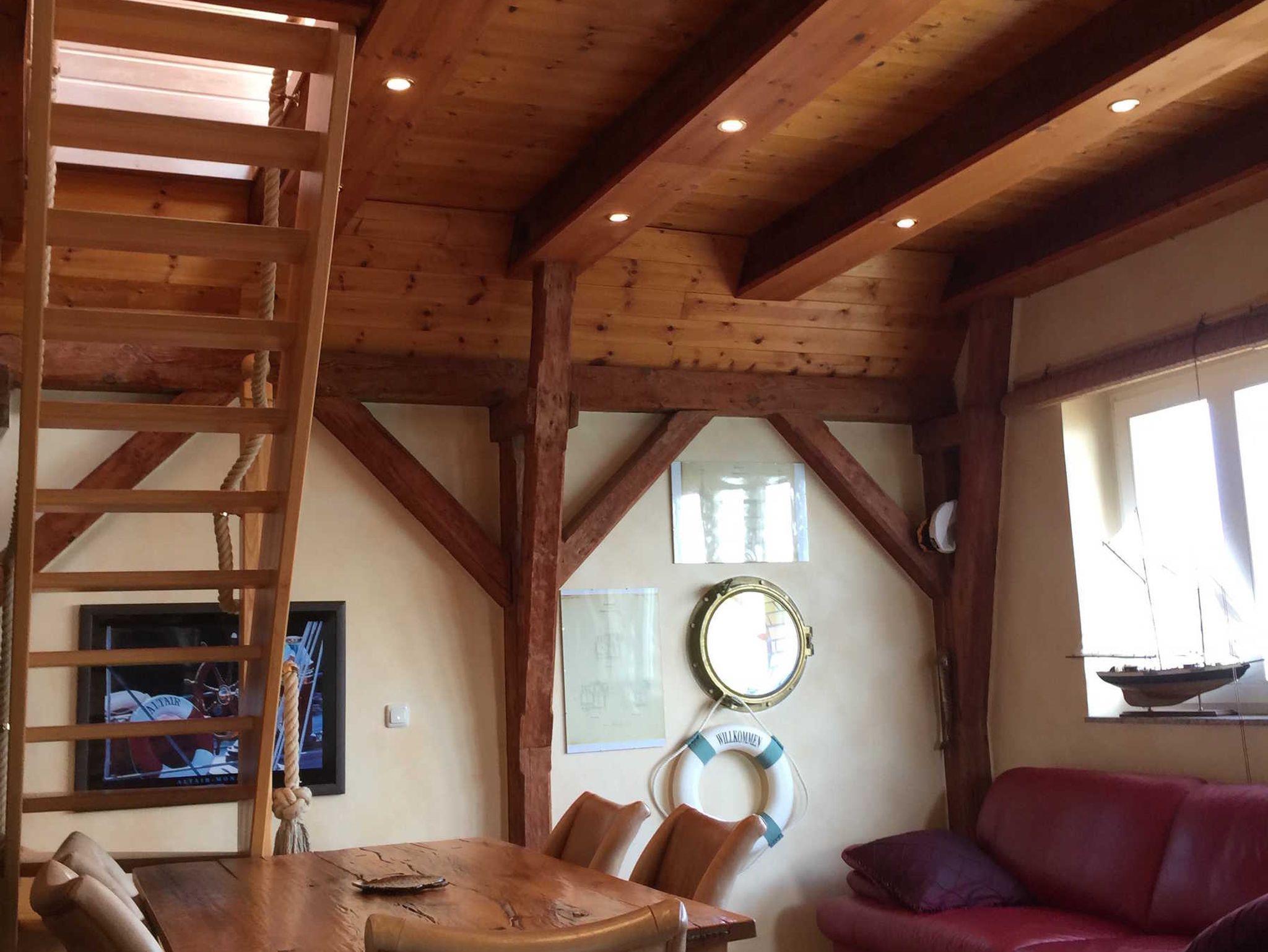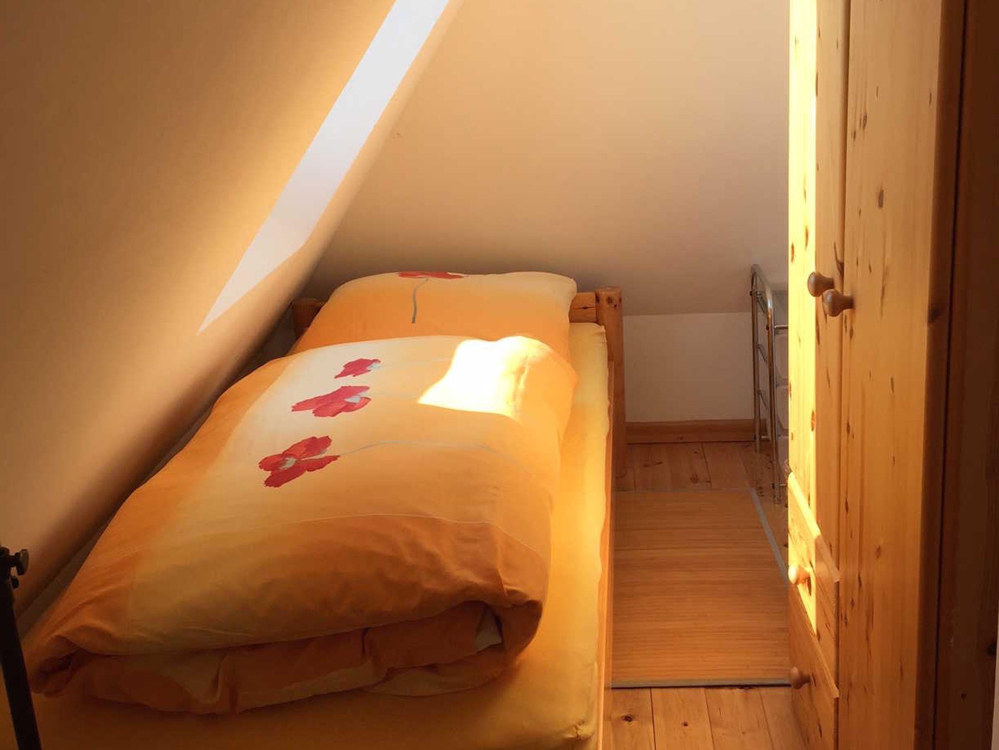 Die kleine Küche/Kitchenette ist mit dem üblichen Geschirr/Besteck etc. ausgestattet. Im Bad befindet sich eine Dusche, die auch als Dampfdusche genutzt werden kann mit zwei Holzsitzen, sowie eine Badewanne. Des Weiteren ist eine Waschmaschine vorhanden. Es gibt drei Schlafzimmer: Ein abschliessbares Zimmer mit zwei Einzelbetten, sowie im oberen offenen Maissonettebereich ein Doppelbett, daneben eine kleine abschliessbare Kammer mit einem Einzelbett. Bettwäsche und Handtücher werden bereitgestellt. Hierfür werden bei Buchung automatisch pro Aufenthalt und Person einmalig 25,00 € berechnet.