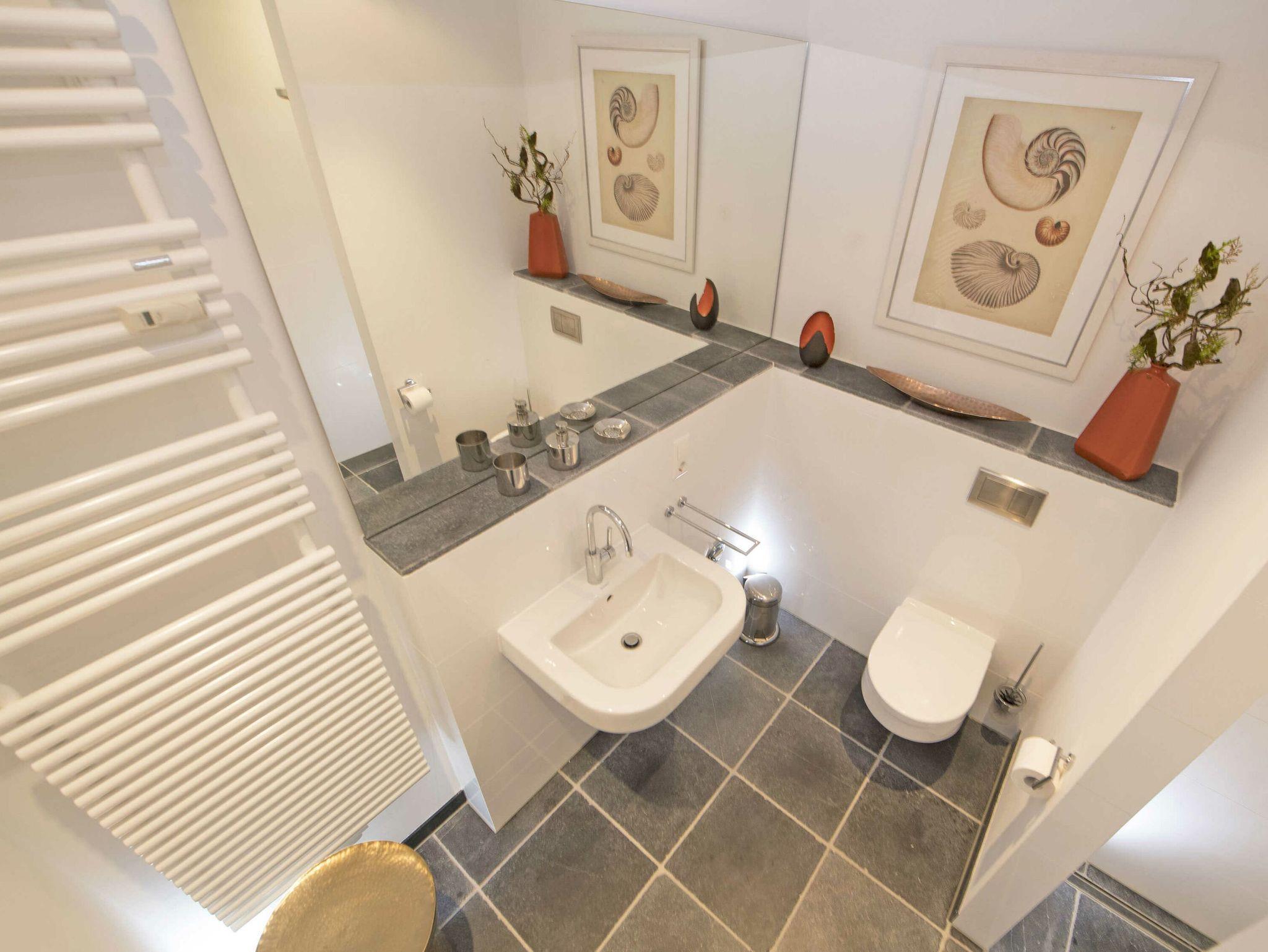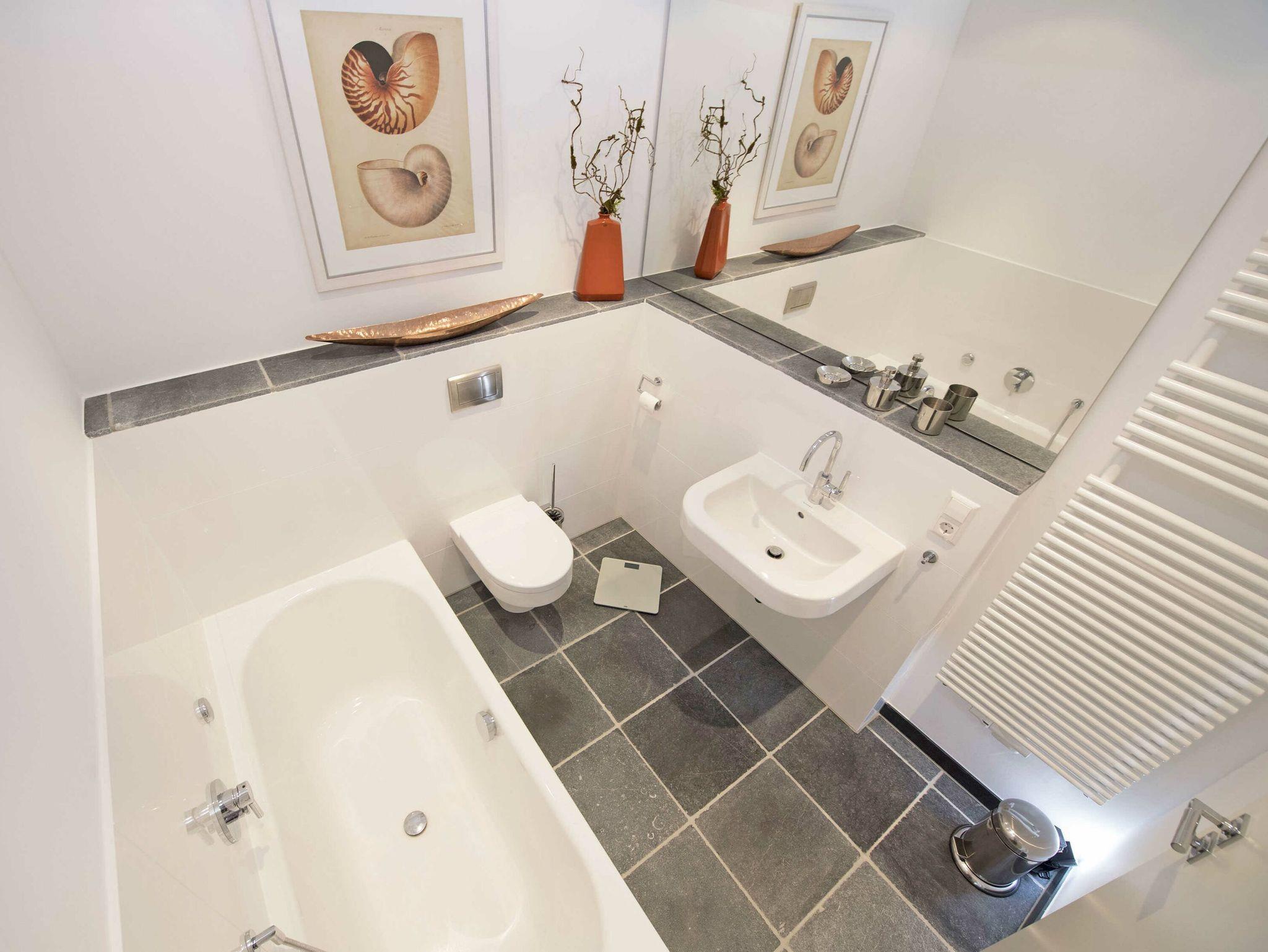 Zwei moderne Bäder, eines davon mit Badewanne, das andere mit ebenerdiger Regen-Dusche und je einem WC und Waschbecken, sind in sehr ansprechender Optik gefliest und mit moderner Sanitärkeramik ausgestattet.