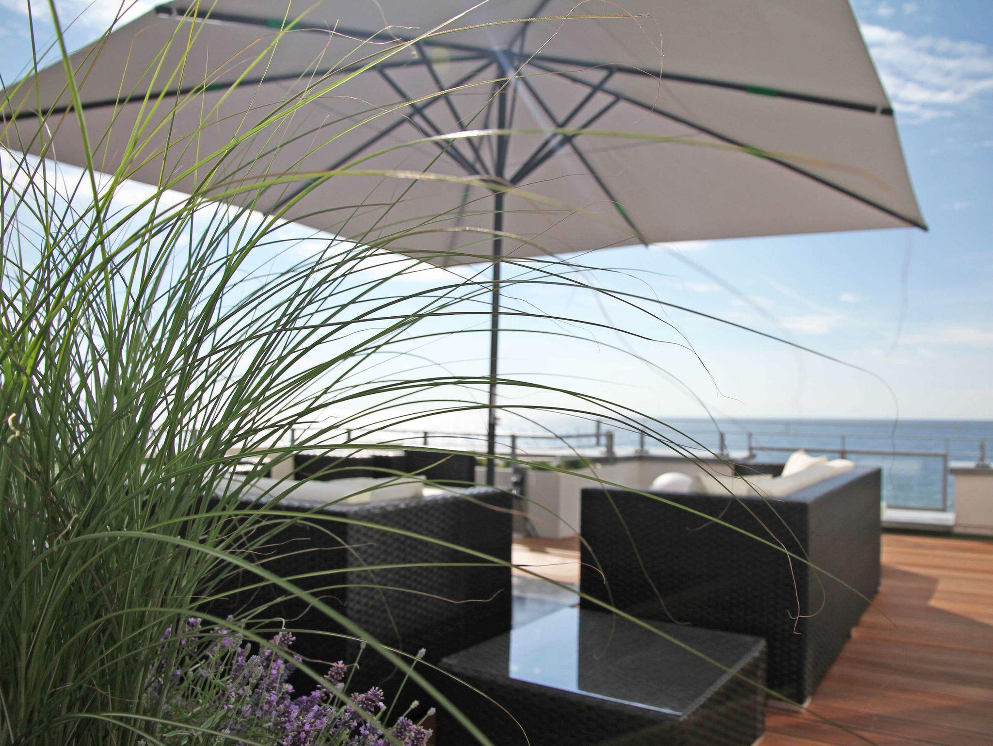 Ein weiteres Highlight des Appartments Sea-Lounge ist die 75 m² große Bangkirai-Dachterrasse mit einem traumhaften Ausblick auf die gesamte Ostsee. Genießen Sie ein sonniges Frühstück mit Blick auf die Ostsee oder entspannen Sie bei dem letzten Sonnenstrahlen. Lassen sie einfach mal die Seele baumeln, diese Terrasse gibt Ihnen den Platz dazu.