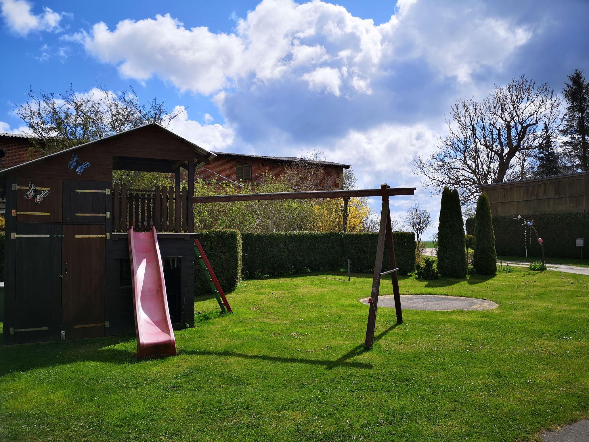 Eine gemütliche Grillecke mit Gartenmöbeln, einen Spielplatz für unseren kleinen Gäste sowie kostenfreie Parkplätze am Haus sind vorhanden.