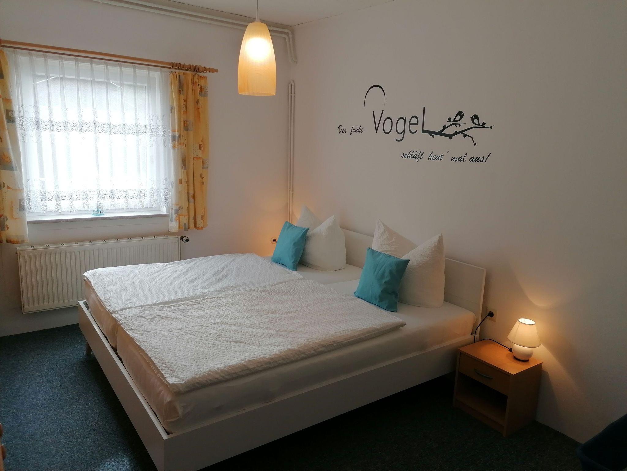 Ein Schlafzimmer mit einem Doppelbett (1,60m x 2,00 m), welches nicht auseinandergeschoben werden kann.