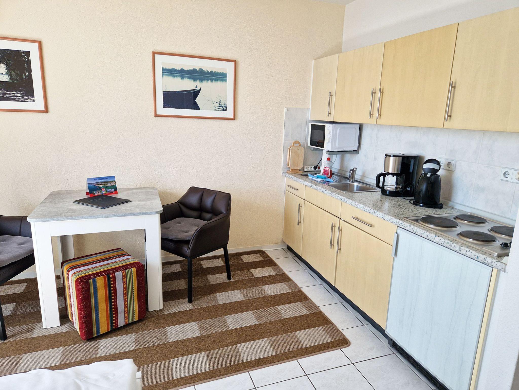 ? Einbauküche mit 4-Plattenherd, Mikrowelle, Kühlschrank, Kaffeemaschine und Wasserkocher.