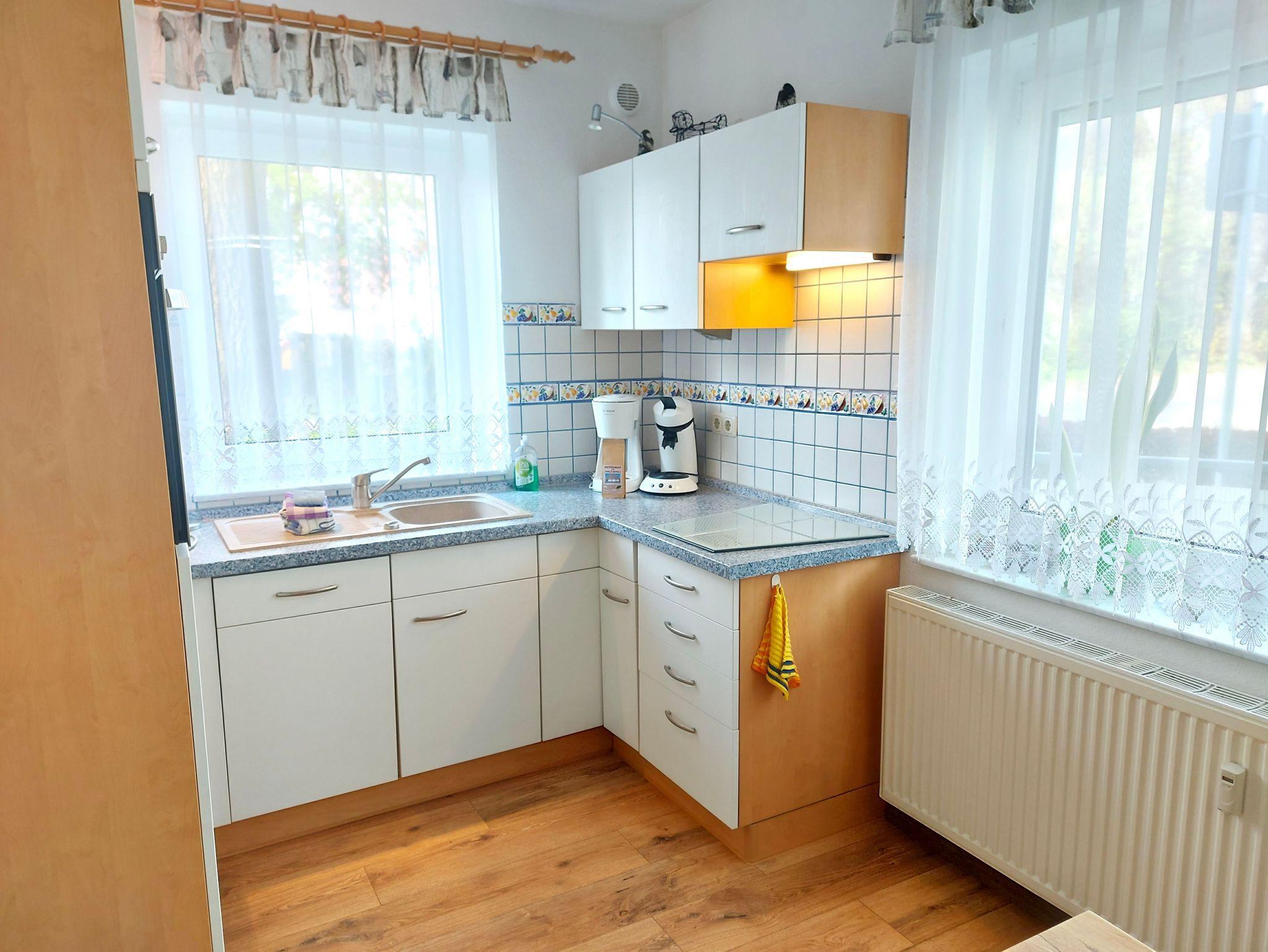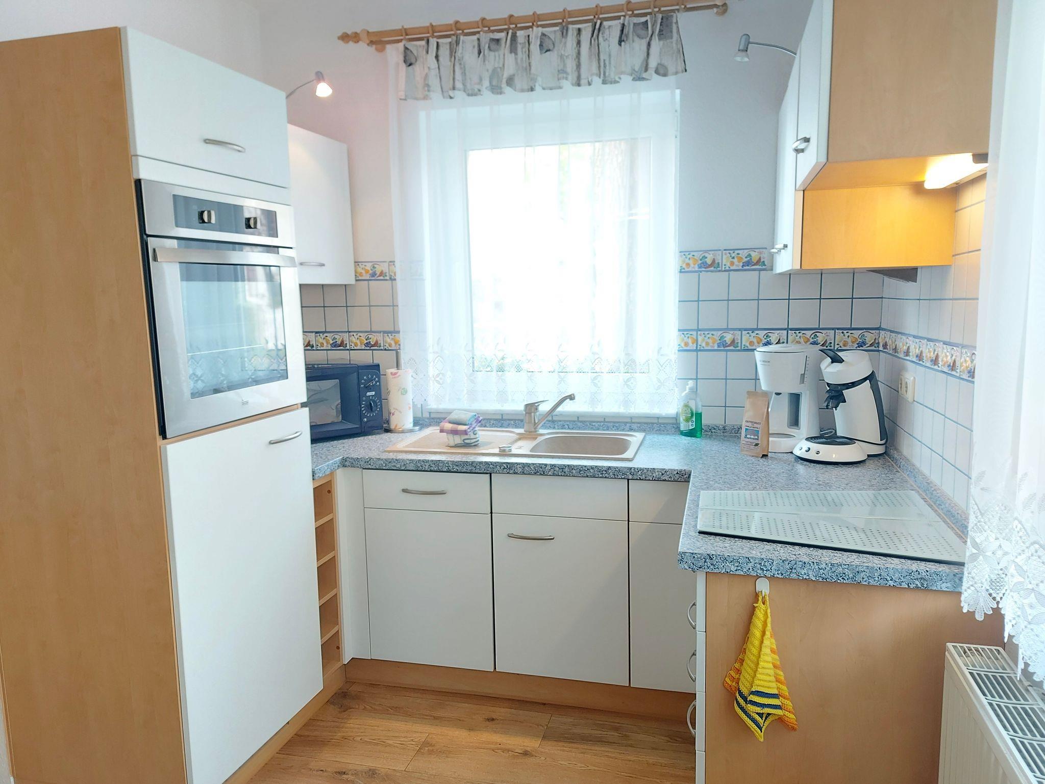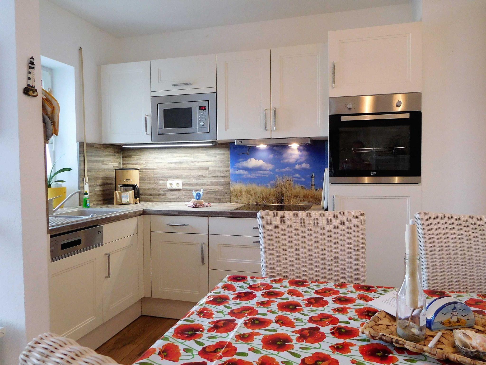 Leckeren Fisch den sie gerade am Hafen direkt vom Fischer geholt haben bereiten sie in der kompletten Einbauküche mit allem Komfort, wie Geschirrspüler, Mikrowelle, Ceranfeld, Kühlschrank mit Gefrierfach, Kaffemaschine, Wasserkocher und Toaster mit Freude zu.