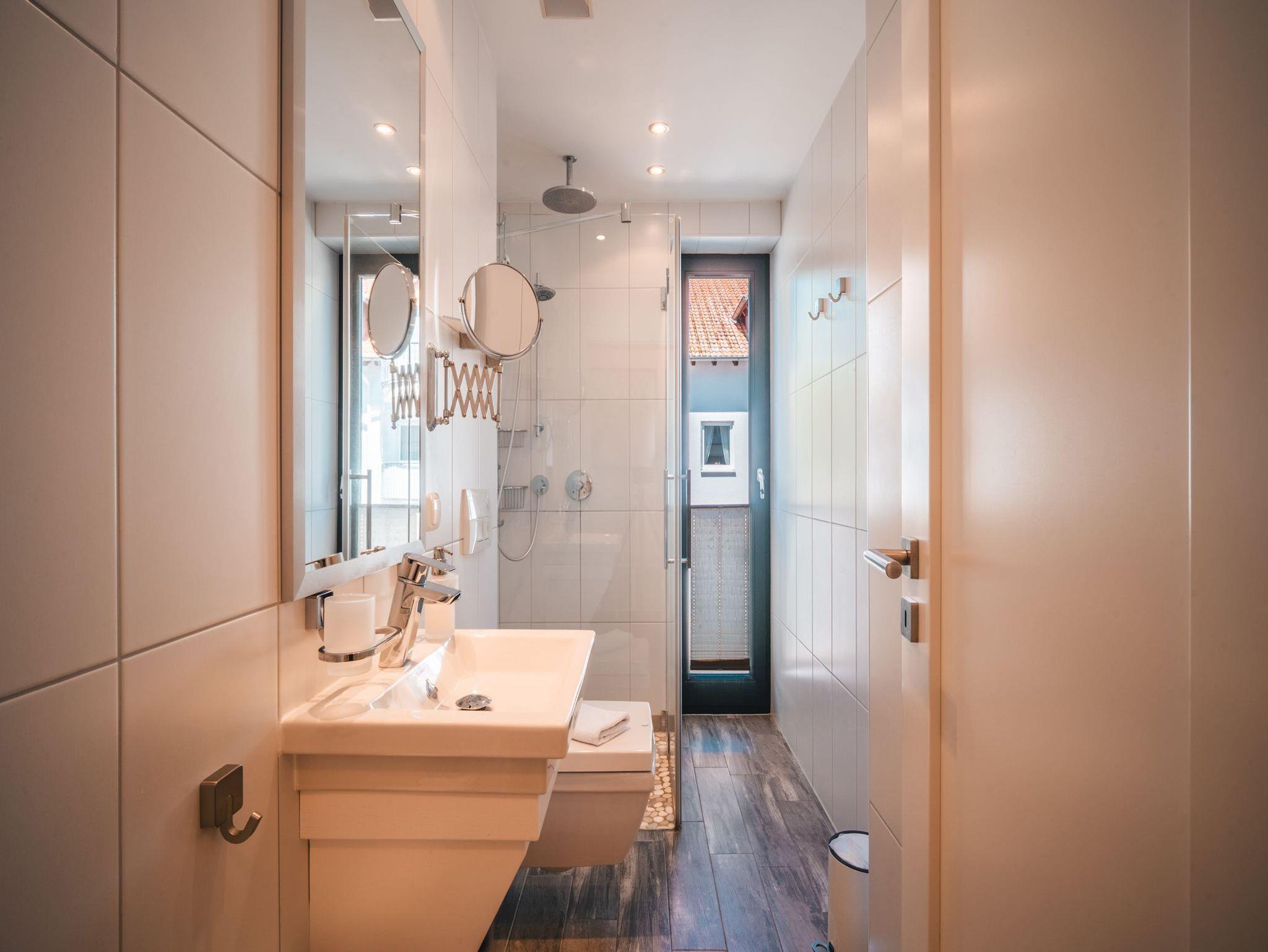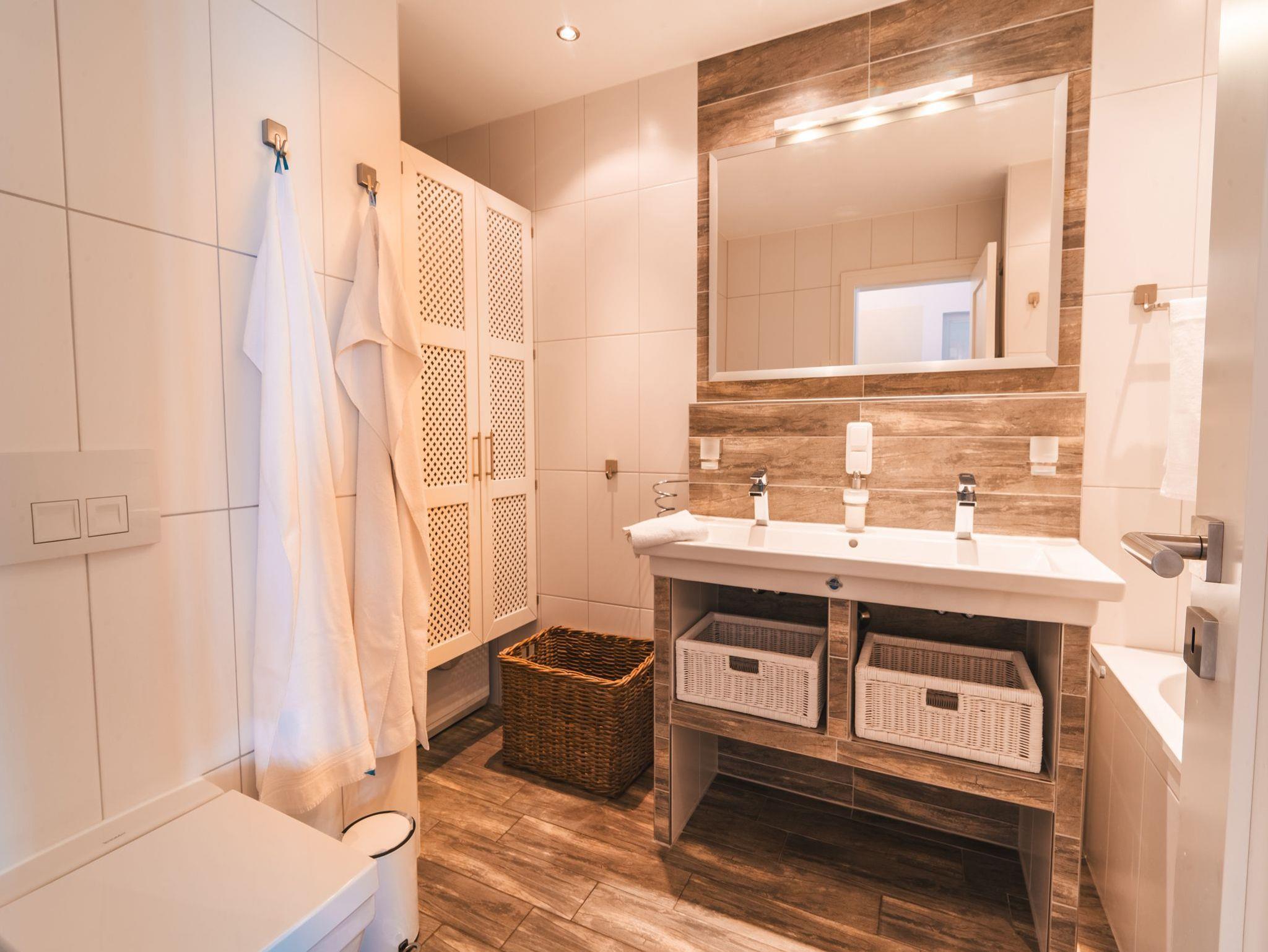 ? Zwei moderne Bäder ausgestattet mit Badewanne, Wellnessdusche und zusätzlichem WC