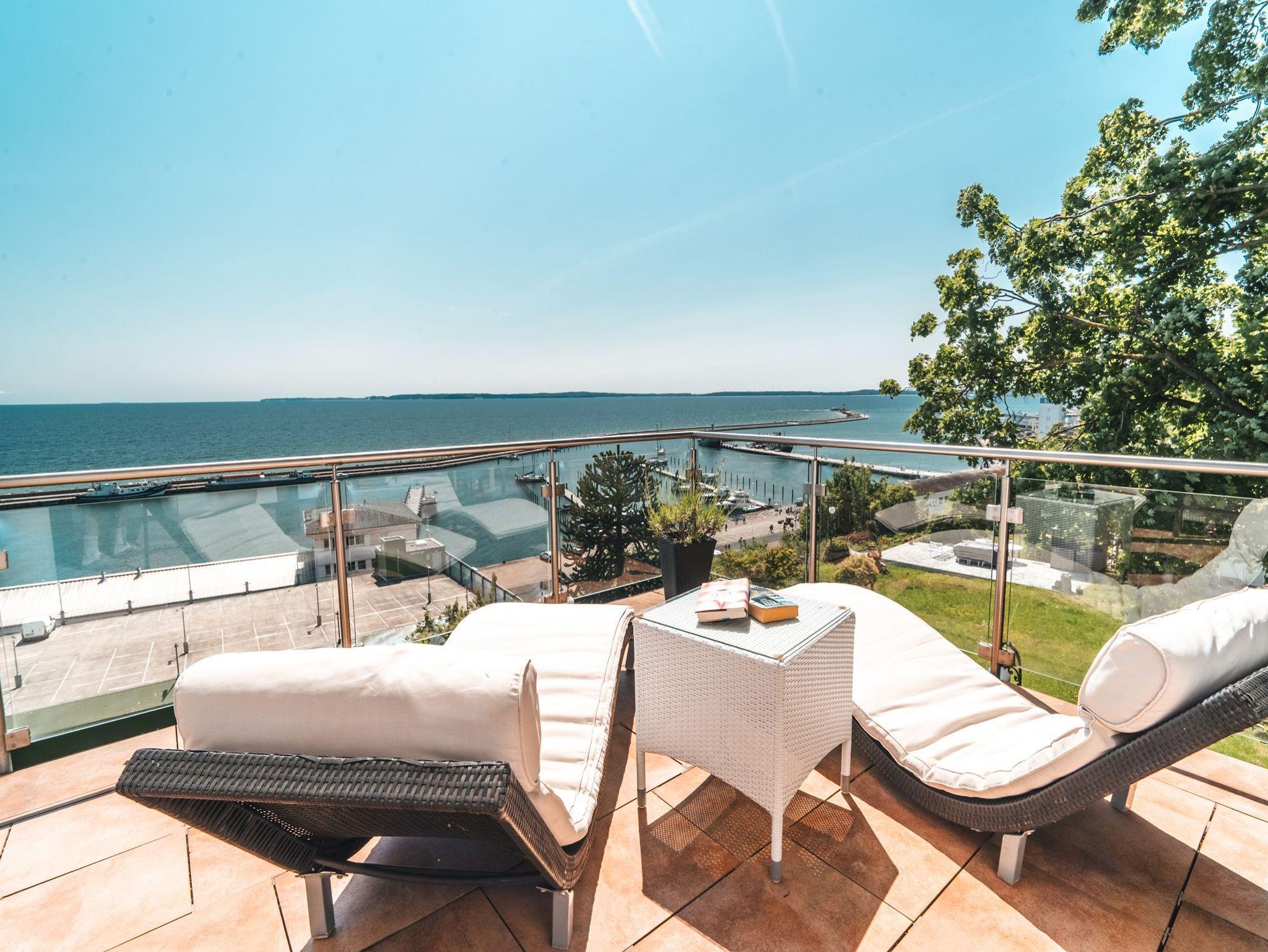 ? Der großzügige Balkon mit Loungemöbeln und Sonnenliegen in Südlage, mit Blick über den Stadthafen von Sassnitz - Ostseeweitblick pur, garantieren einen erholsamen Urlaub.