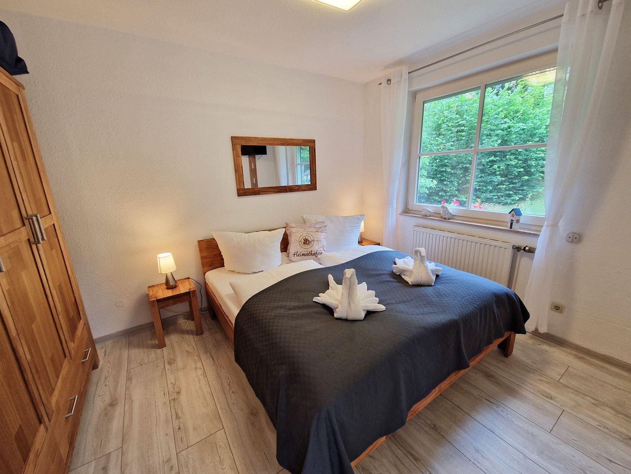• Das Schlafzimmer bietet ein großes Doppelbett, Kleiderschrank, Nachttischen und je eine Leselampe.