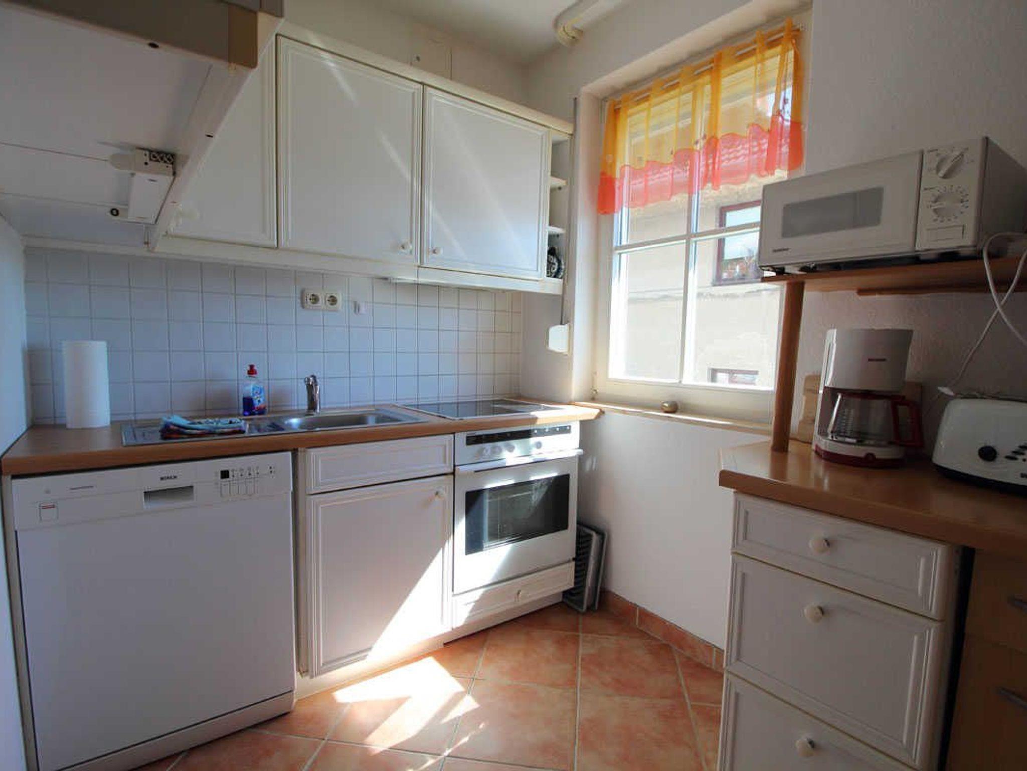? Die Küche ist komplett eingerichtet mit Kühlschrank, Herd mit Backofen, Spülmaschine, Mikrowelle, Toaster und Wasserkocher .