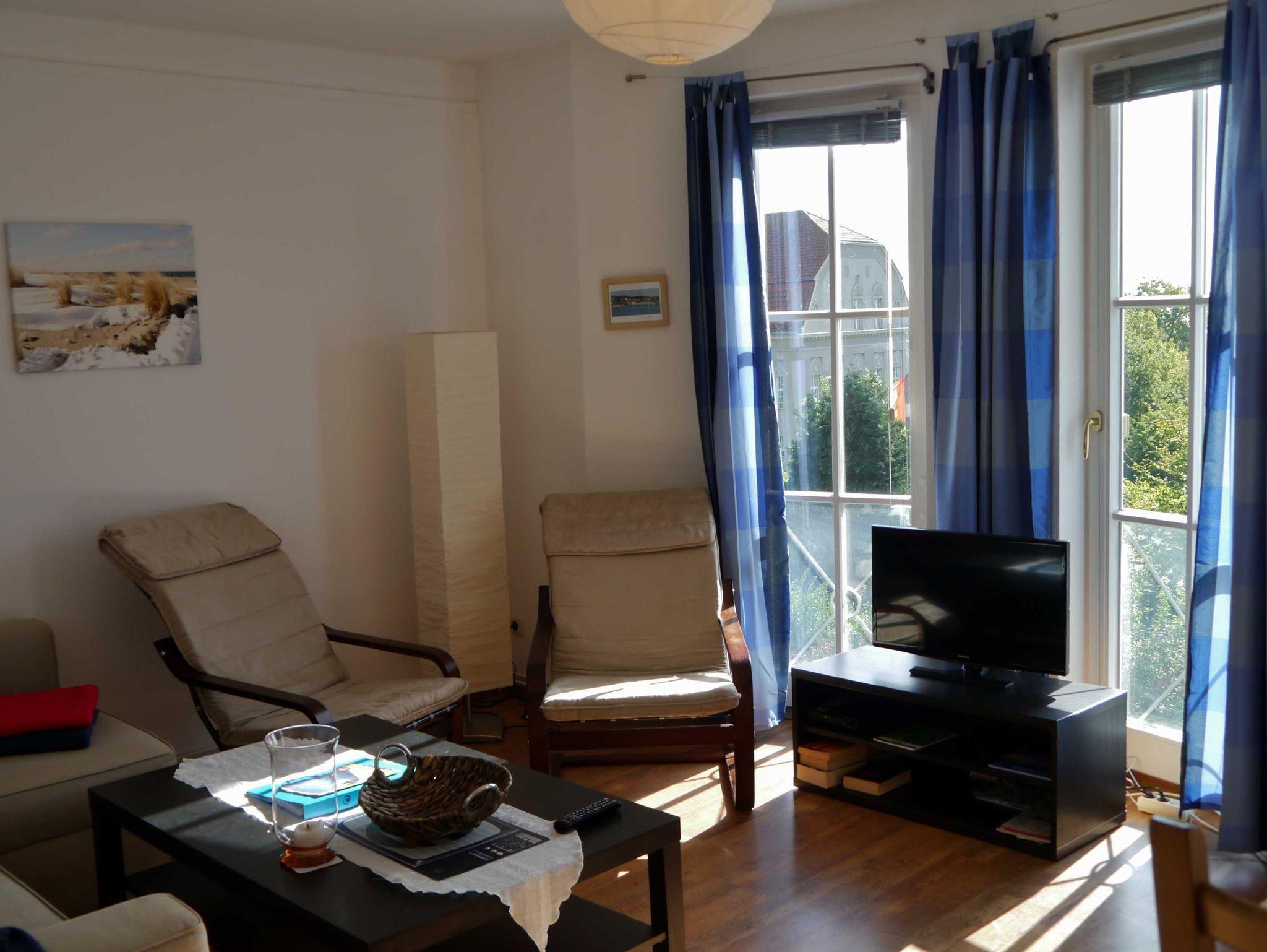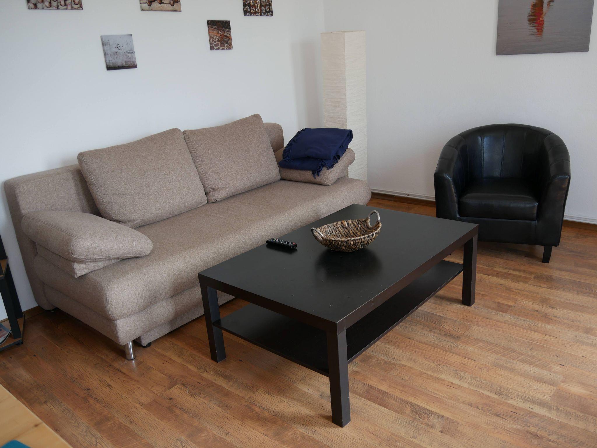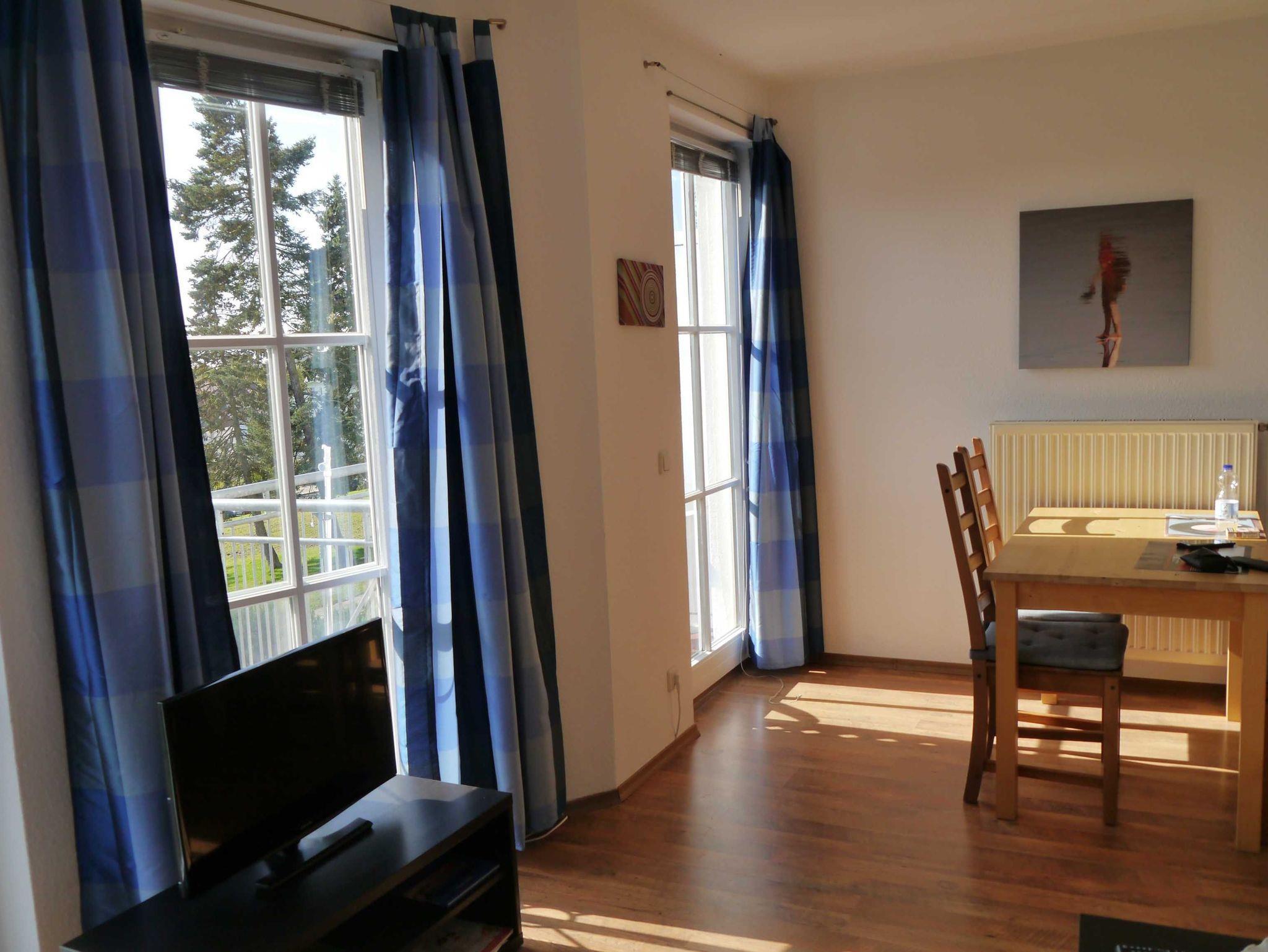 ? Im hellen Wohnzimmer mit bodentiefen Fenstern gibt es ein Sofa, einen Sessel, einen Esstisch mit 4 Stühlen, Flachbild TV, Radio.