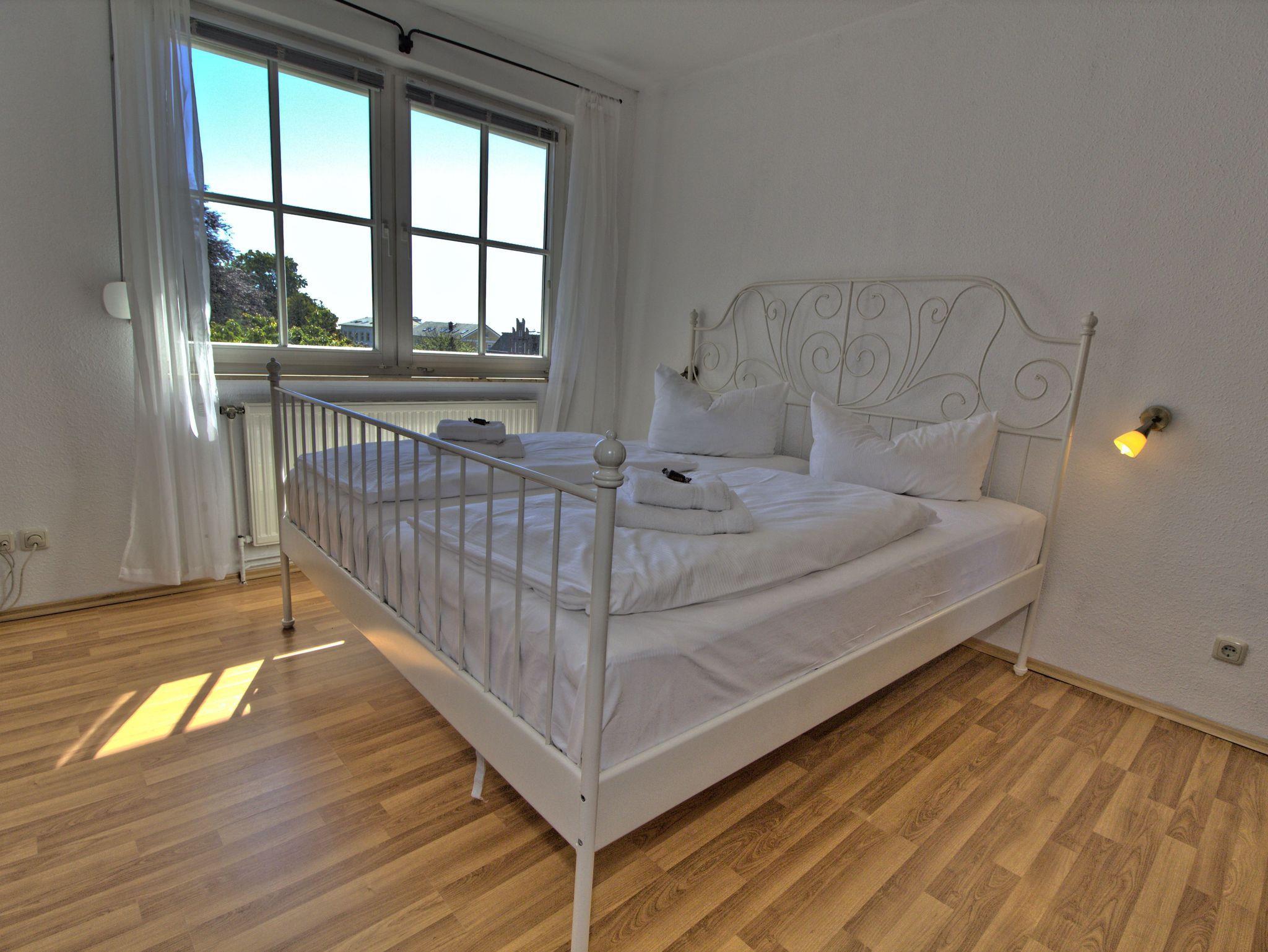 ? Das Schlafzimmer ist mit einem bezogenen Doppelbett ausgestattet. Für Gepäck/Garderobe ist ausreichend Stauraum vorhanden.