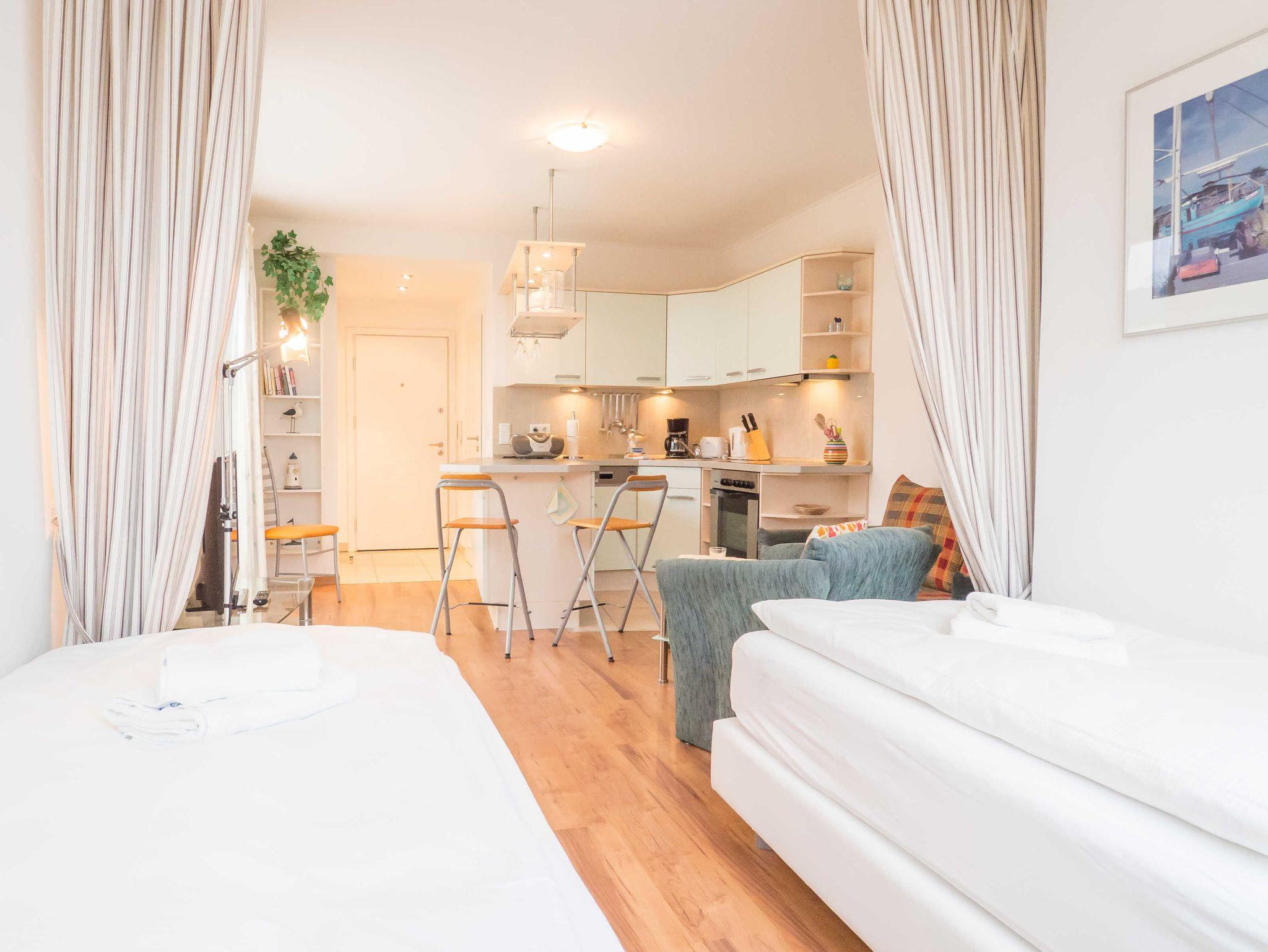 Das Appartement bietet alles, was Sie benötigen: gemütlicher Sitz- und TV-Bereich, eine moderne, helle und vollständig ausgestattete Einbauküche, einen flexibel gestalteten Schlafbereich und natürlich ein schönes Duschbad.