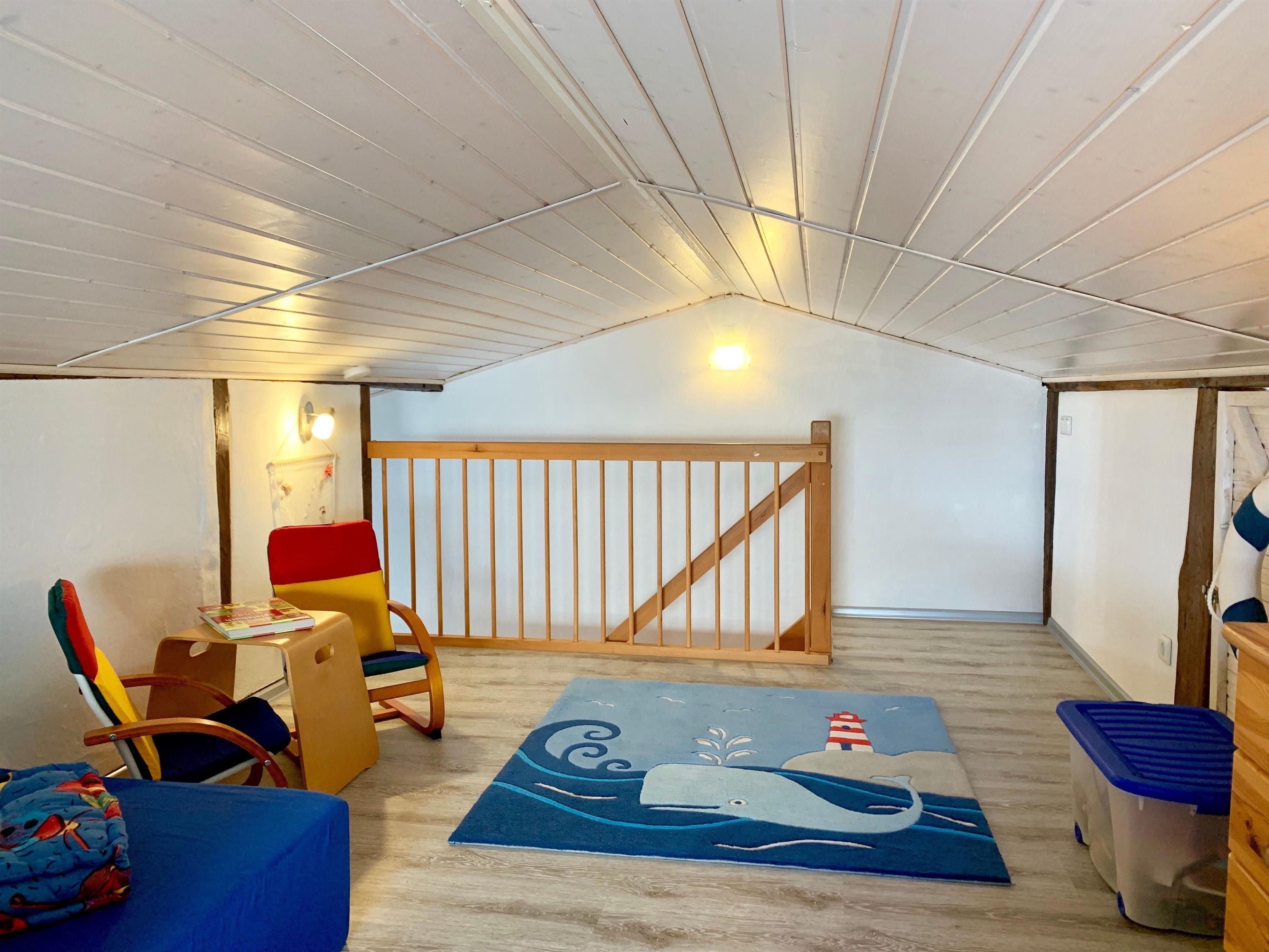 Der ausgebaute Dachboden ist ca 20m2 groß und hat allerdings nur eine eingeschränkte Höhe und Schrägen. Erwachsene können dort nur geduckt laufen.