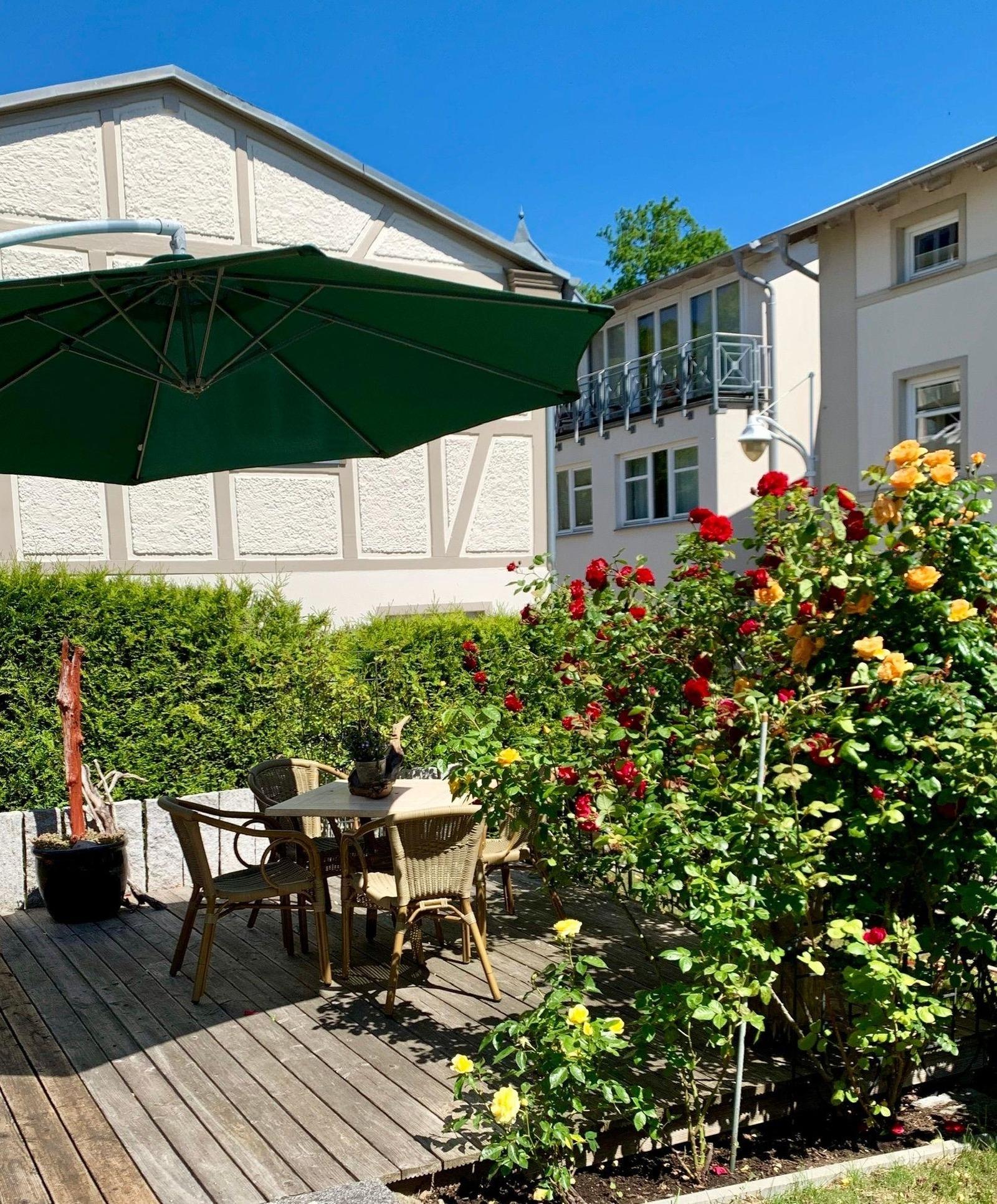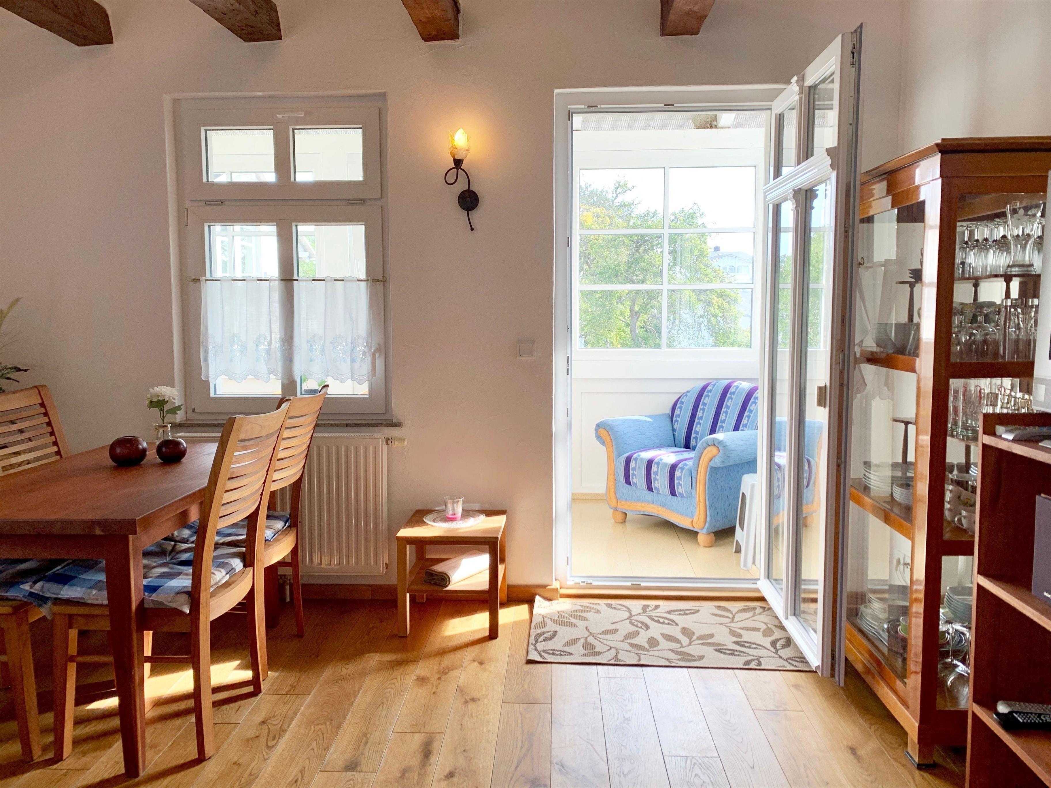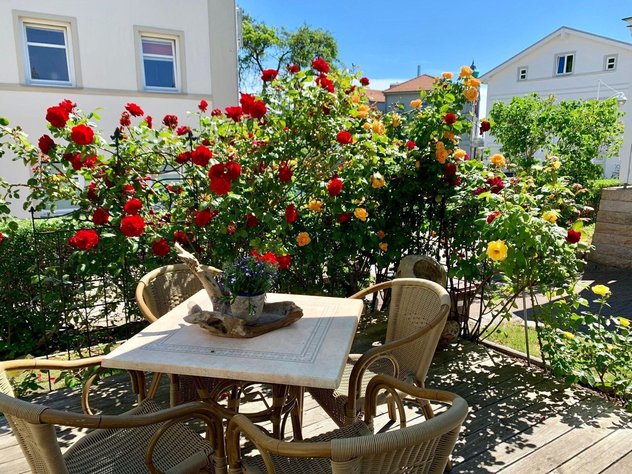 Zur Ferienwohnung gehören eine Terrasse im Garten mit Blick in die Sassnitzer Altstadt. Von der Wohnzimmerterrasse typisch im Bau der alten Fischerhäuser haben sie Blick auf das Meer und die Altstadt. Ein Parkplatz befindet sich direkt am Haus, eine Seltenheit in der Sassnitzer Altstadt.
