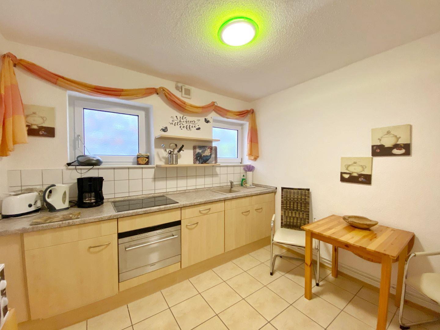 Die 2-Raum-Ferienwohnung ist ca. 42 qm groß, befindet sich im Erdgeschoss und ist über die Terrasse erreichbar. Von hier kommend gelangt man in das Wohnzimmer mit gemütlicher Sitzecke, SAT-TV, DVD-Player und Radio. Das Schlafzimmer verfügt über ein Doppelbett und Kleiderschrank. Die separate Küche mit Esstisch bietet u.a. eine Mikrowelle, Ceranfeld, Kühl-/Gefrier- kombination, Toaster, Wasserkocher, Kaffeemaschine, diverses Geschirr und einen Geschirrspüler. Die Wohnung verfügt über ein Bad mit Dusche/WC und Haartrockner. Es gibt in der Wohnung ein WLAN.