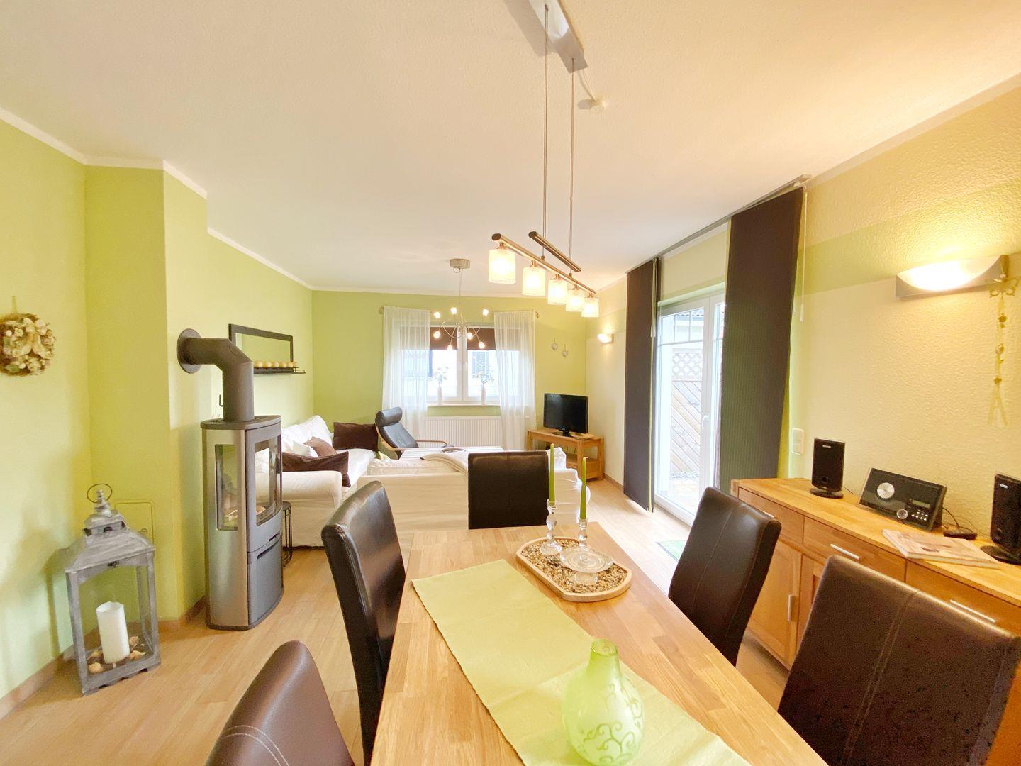 Die offene, moderne Einbauküche ist in den großzügigen Wohnbereich integriert und lässt keine Wünsche offen. Sie ist ausgestattet mit Geschirrspüler, Backofen, Ceranfeld, Mikrowelle, Kühlschrank mit Gefriermöglichkeit, Kaffeemaschine, Toaster, Wasserkocher und einer Vielzahl an weiterem Küchenzubehör. Es gibt zwischen Küche und Wohnbereich einen großen Esstisch mit gemütlichen Stühlen. Vor dem Wohnbereich mit der gemütlichen Sitzecke und Kamin befindet sich die Terrasse mit Gartenmöbeln und zwei Liegestühlen. Im Erdgeschoß gibt es ein Bad mit Echtglasdusche, WC, Waschtisch, Waschmaschine und Trockner. Von der Diele aus führt eine Treppe ins Obergeschoß. Im Obergeschoß gibt es neben einem weiteren Wohnbereich mit Couch, Sesseln und Flachbild-TV drei separate Schlafzimmer. Zwei der Schlafzimmer verfügen über je ein Doppelbett, das dritte Schlafzimmer bietet zwei Einzelbetten. Im OG gibt es ein weiteres großzügiges Badezimmer mit Dusche, Badewanne, Waschtisch und WC. In beiden Bädern gibt es Haartrockner. WLAN ist im Haus vorhanden. Außerdem gibt es ein Kinderbettchen und einen Hochstuhl. Ein Grill ist vorhanden.