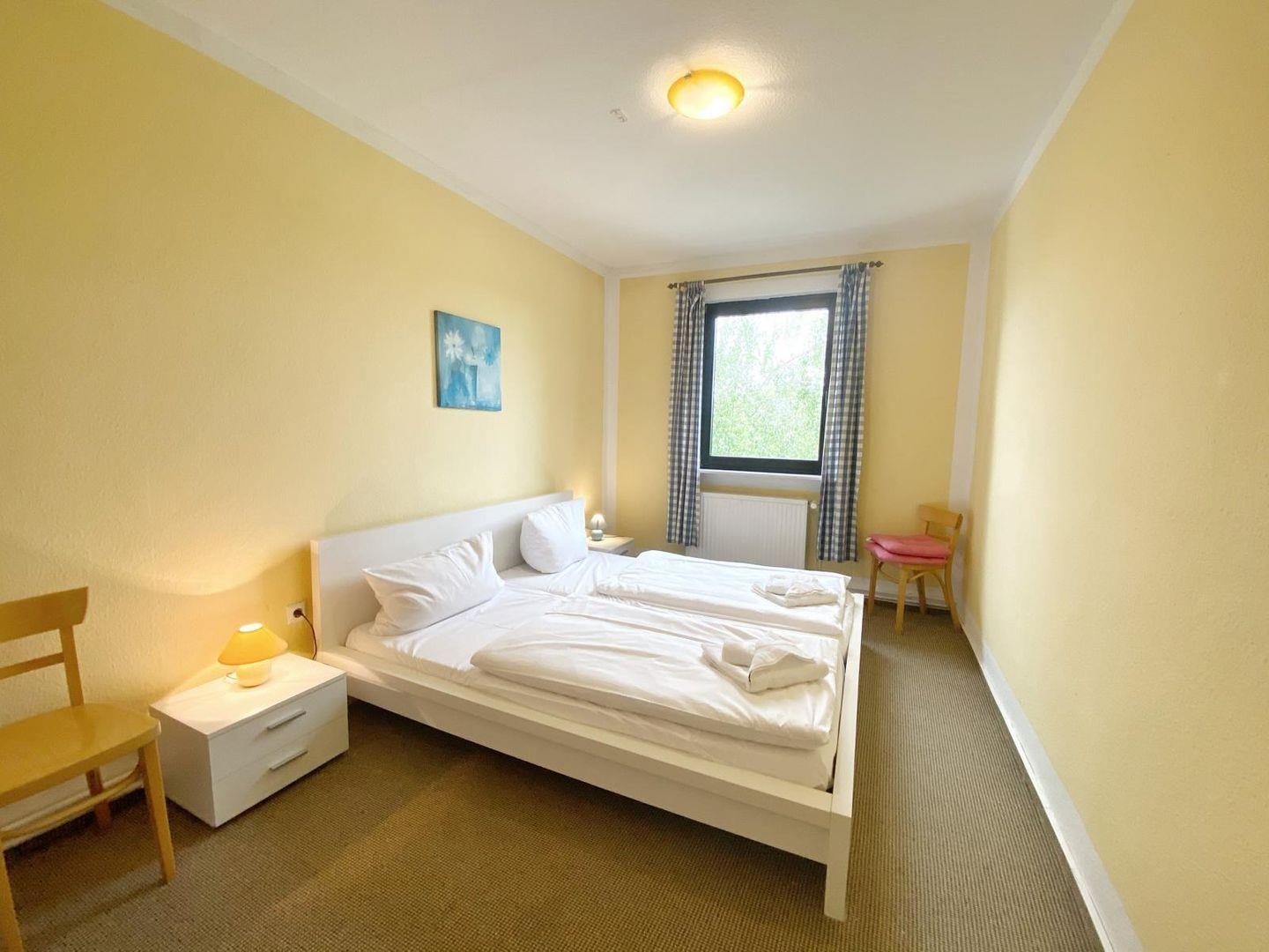 Von hieraus gelangen Sie in das erste behagliche Schlafzimmer mit einem bequemen Doppelbett und einem Kleiderschrank.