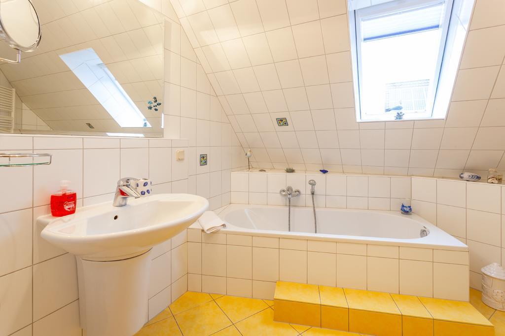 Es gibt ein Gäste-WC im Erdgeschoss und ein großes, helles Bad mit Dusche und Badewanne im Obergeschoß.