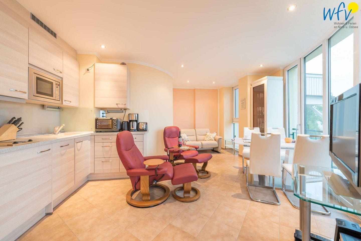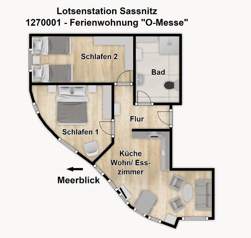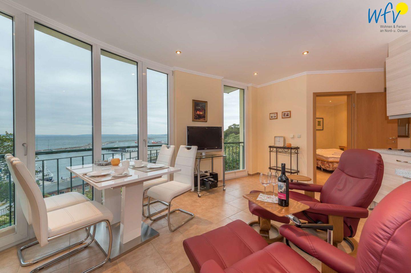 Stilvolles Mobiliar, ein wunderbarer Lichteinfall sowie eine optimale Raumaufteilung mit Wohnraum, integrierter Küche, zwei separaten Schlafzimmern und Duschbad machen die Ferienwohnung "O-Messe" zu Ihrer persönlichen Wohlfühloase! Genießen Sie im komfortablen Wohnraum einen einmalig schönen Blick auf den Sassnitzer Hafen und die Binzer Bucht. Durch die außergewöhnlich breite Fensterfront haben Sie sowohl vom Esstisch aus, als auch in den Relaxsesseln eine traumhafte Aussicht!